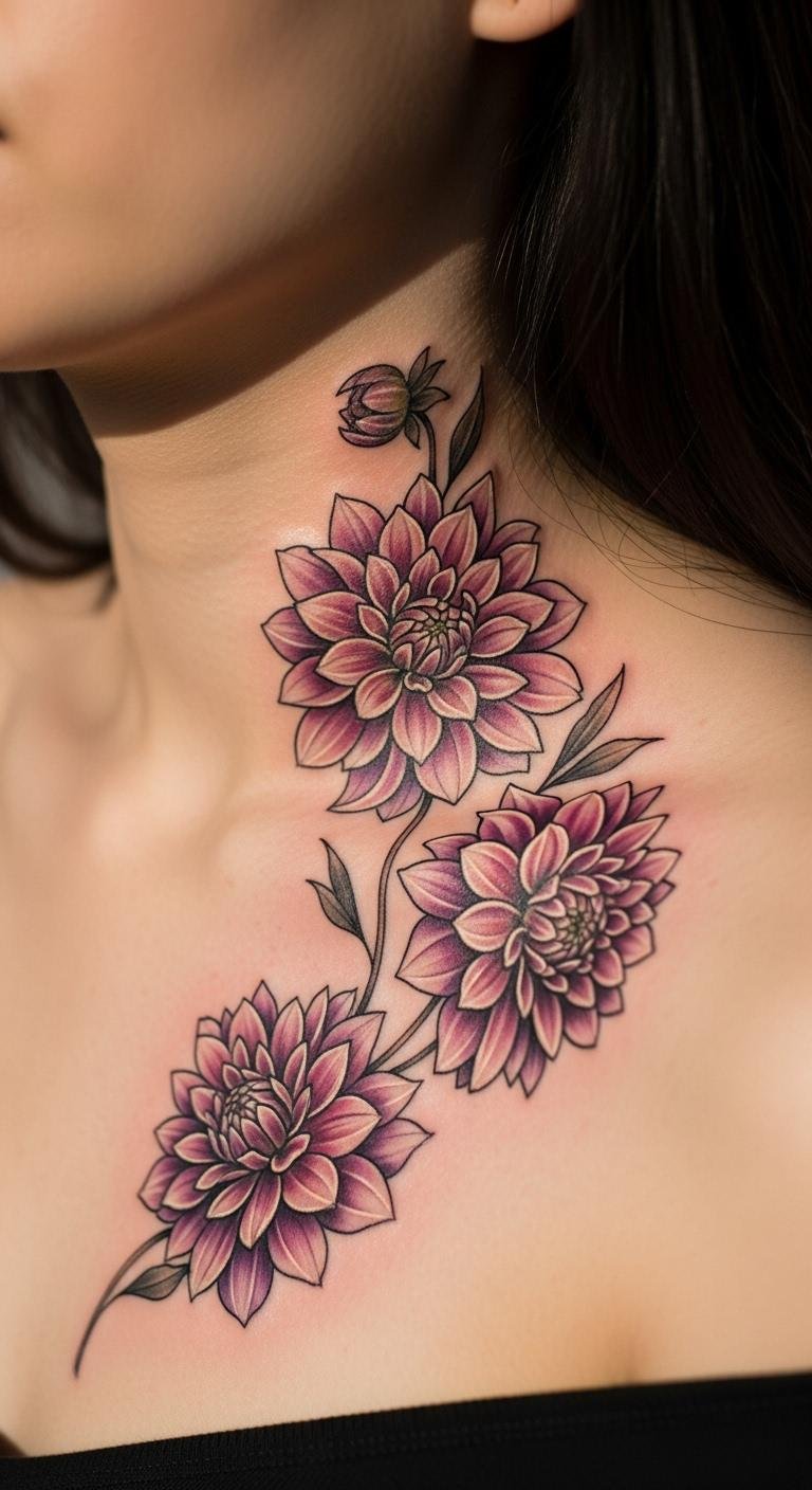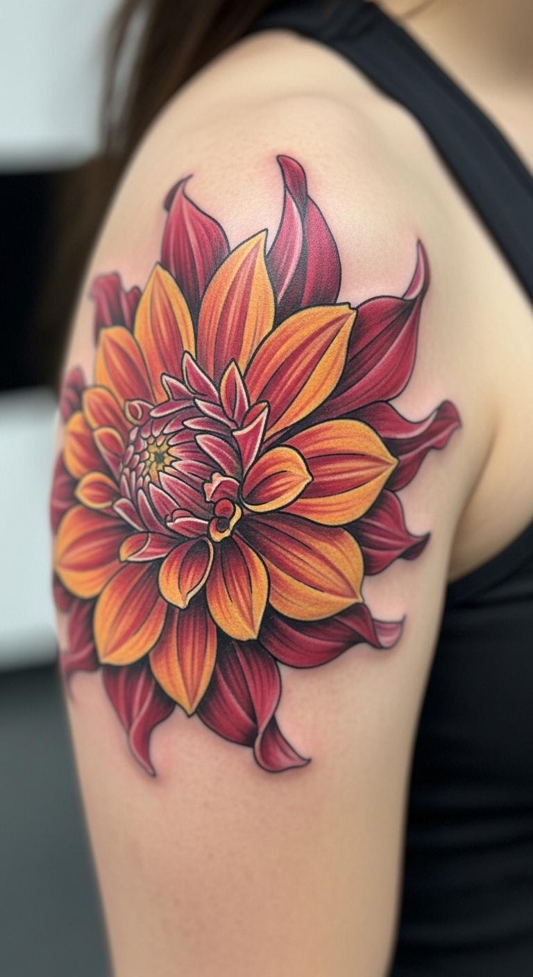 Shoulder dahlia tattoos frame your body nicely. This spot hides or shows as needed. Go for it if you want versatility. Plan with body-safe markers at home. Prices range from $90 up. Add curves to match your shoulder shape. Look for walk-in studios. This placement enhances movement. Draw templates on paper first. You’ll find it practical and affordable.