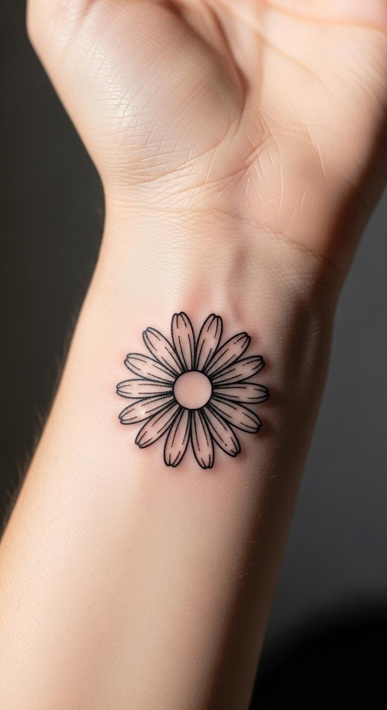 A minimalist daisy keeps things straightforward. Think one small flower with just a few lines. This style works for first-timers. Pick a spot like your wrist for easy daily view. Use a fine-tip pen at home to sketch ideas on paper first. It costs nothing extra. Add a dot in the center for a twist. Keep the design under 2 inches to save on artist fees. Go with black ink for longevity. This approach lets you test the look without commitment. Try drawing on your skin with washable marker for practice. Focus on balance so it looks neat. End up with something timeless and affordable.
