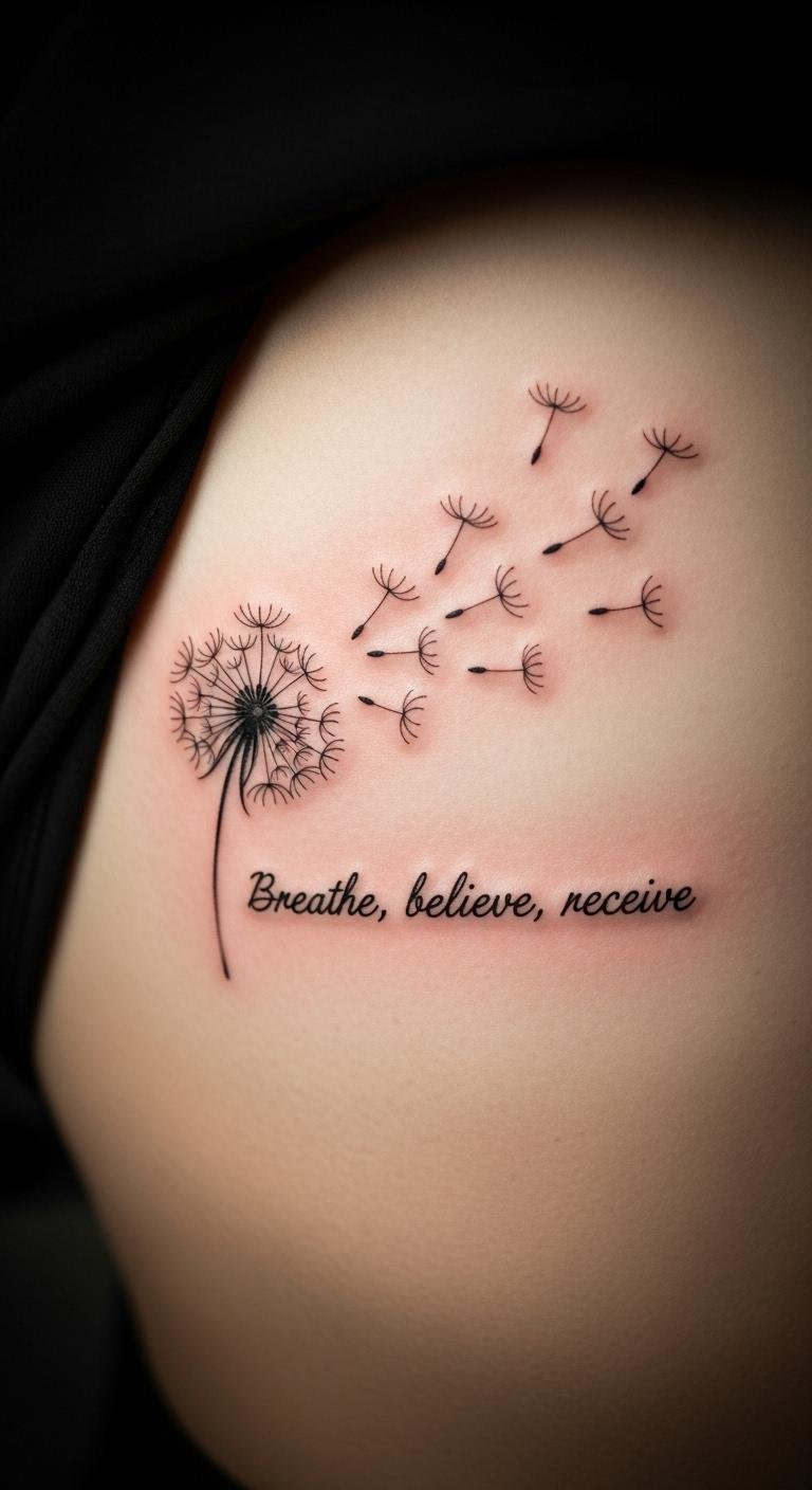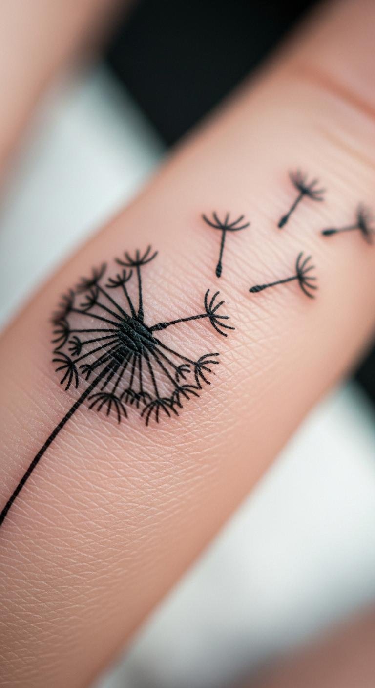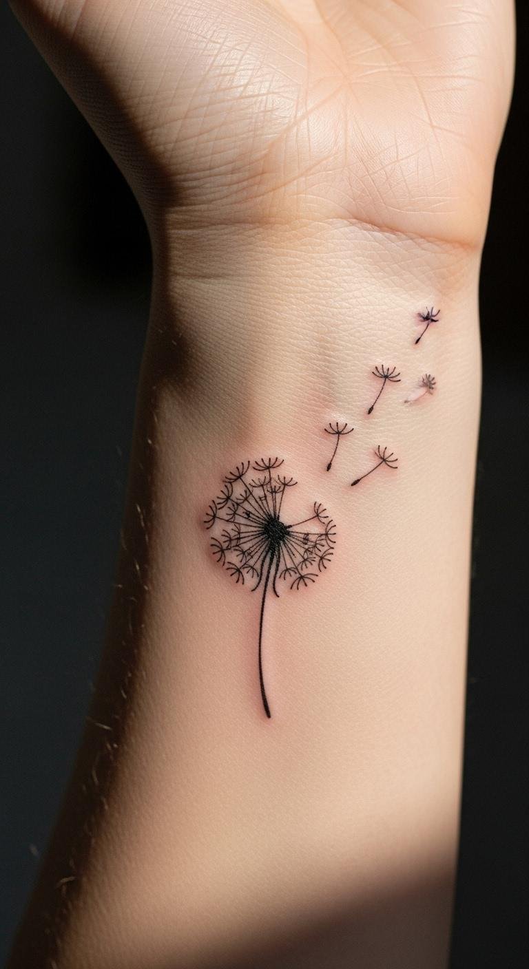 A minimalist dandelion on the wrist keeps things simple and symbolic. Think a single stem with seeds blowing away. This design fits everyday life. It reminds you of freedom every time you glance at it. Start by sketching on paper with a basic pen. Use free online templates to guide your drawing. Find a local artist for under $100 if you’re on a budget. Add a personal twist, like varying seed directions. Keep the lines thin for less pain. This idea works for first-timers. Pair it with nature-inspired colors if you want subtle ink. Go for black and gray to save on costs. Practice the design at home with washable markers. It’s an easy way to test before committing. Remember, placement like the wrist hides easily at work. Choose a spot that feels freeing to you. This tattoo says “let go” without overwhelming your skin.