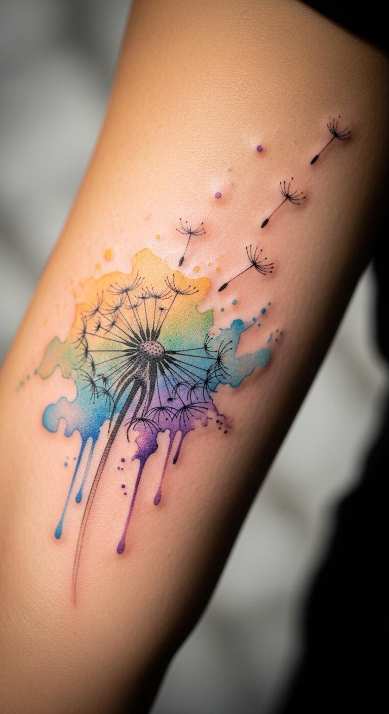 Watercolor dandelions add a playful, airy vibe to freedom themes. Imagine soft blends of yellow and white seeds drifting across your arm. This style mimics paint strokes for a light feel. Draw it yourself using watercolors on paper first. It helps you experiment cheaply. Look for affordable kits online for under $10. Blend colors gently to capture the wind effect. Visit a budget tattoo shop that offers this technique. Prices start at $150 for small designs. Add elements like faint wind lines for extra meaning. Keep the size small to reduce discomfort. This idea suits creative types. Use phone apps to preview how it looks on your body. It’s a fun DIY step. Focus on freedom by making seeds point outward. The result is a tattoo that feels alive and liberating.