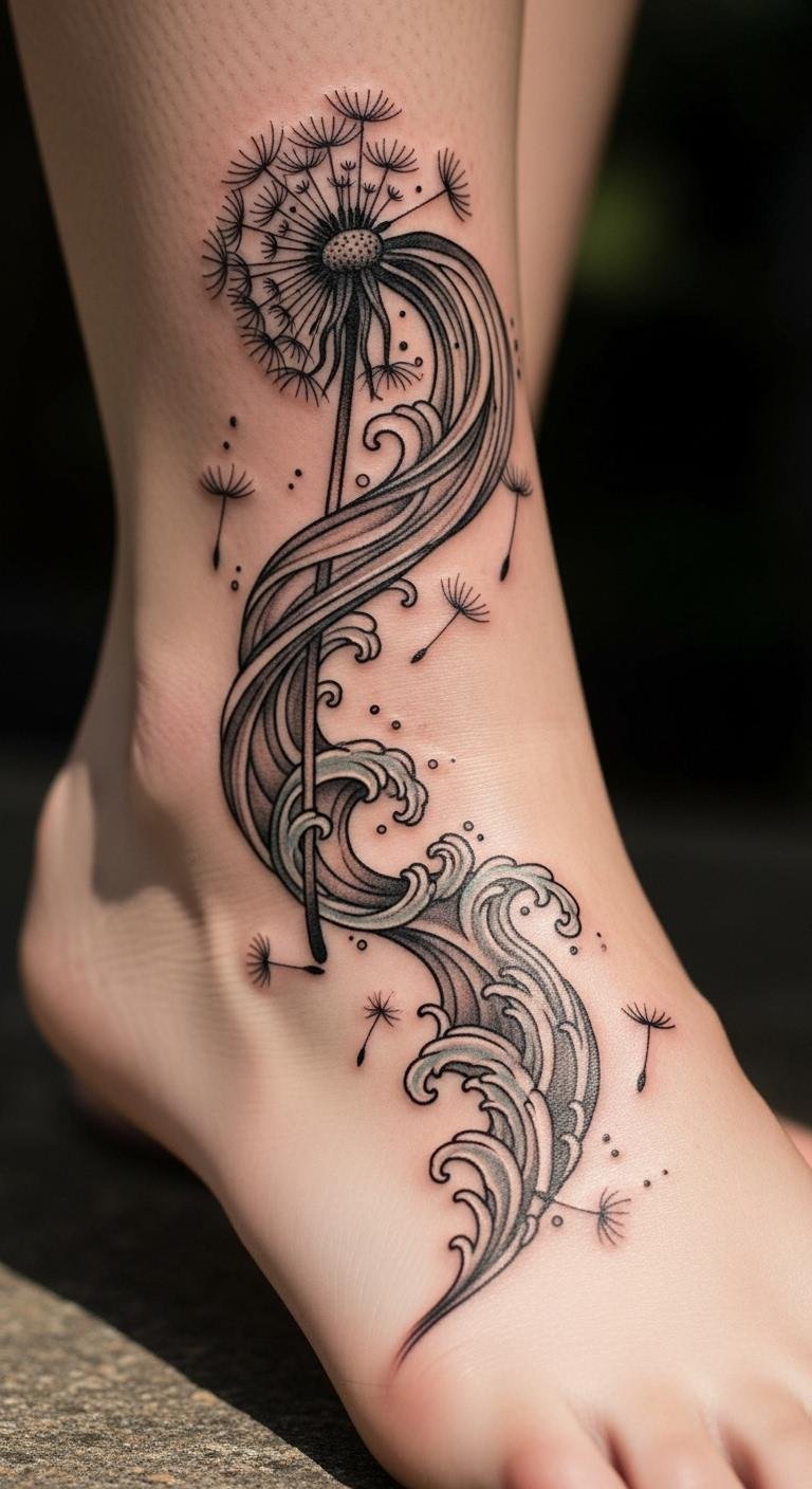 Dandelions with waves on the foot mix freedom with flow. Seeds merge into wave patterns. Draw waves next to dandelions on paper. Use ocean sketches for ideas. Foot tattoos cost $60. Keep waves simple for affordability. This design suggests drifting free. Trace on shoes at home for previews.
