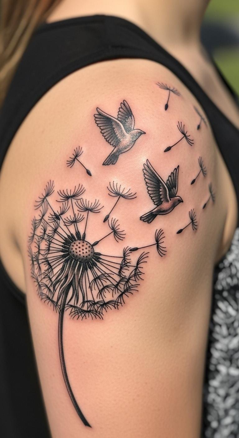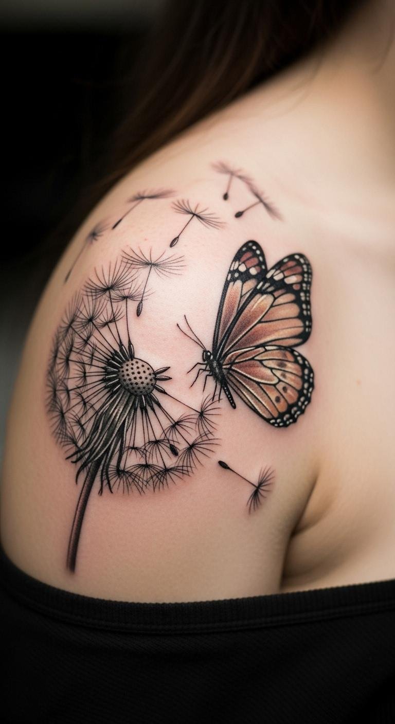 Dandelion butterflies on the shoulder symbolize flying free. Butterflies emerge from seeds. Sketch butterflies with dandelions on paper. Use nature guides. Shoulder designs cost $130. Add one butterfly for value. This tattoo shows growth. Draw on butterflies at home.