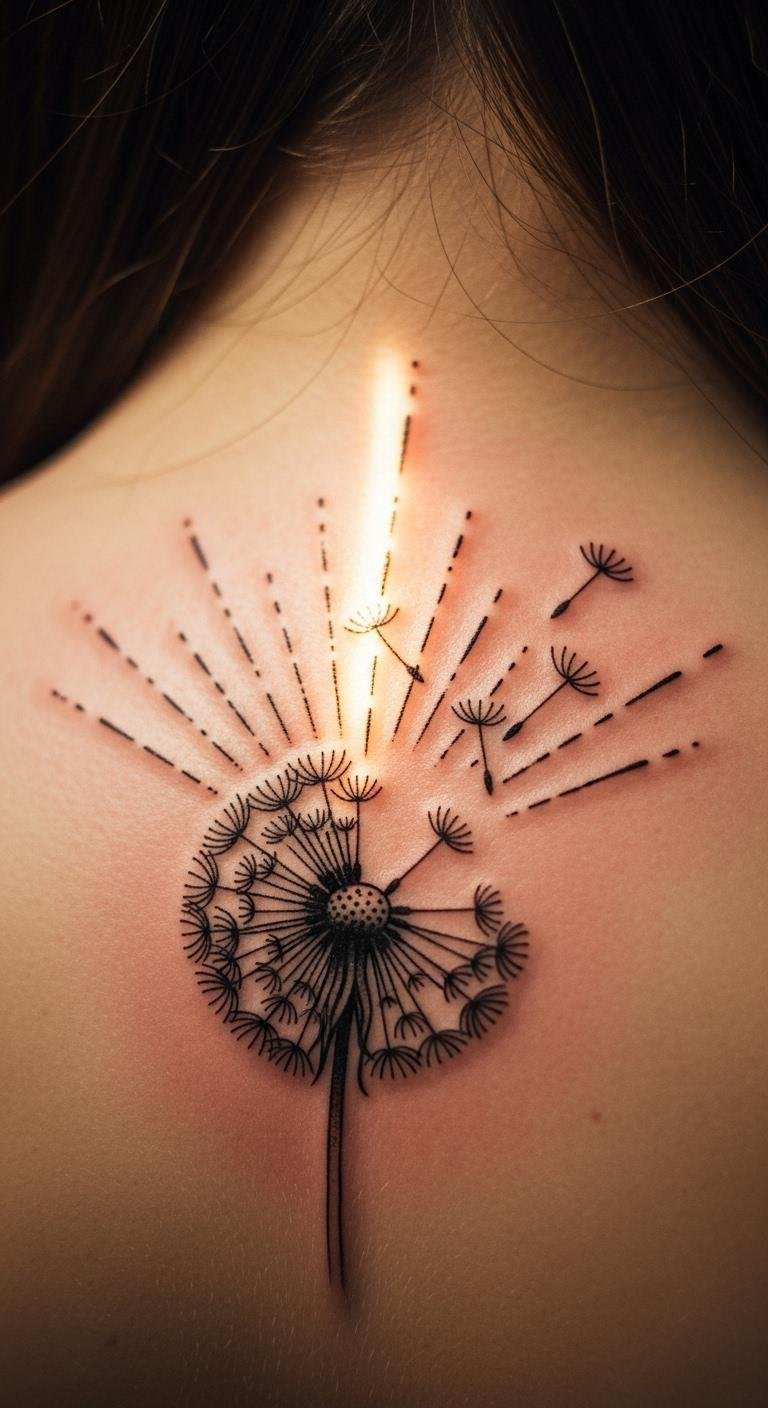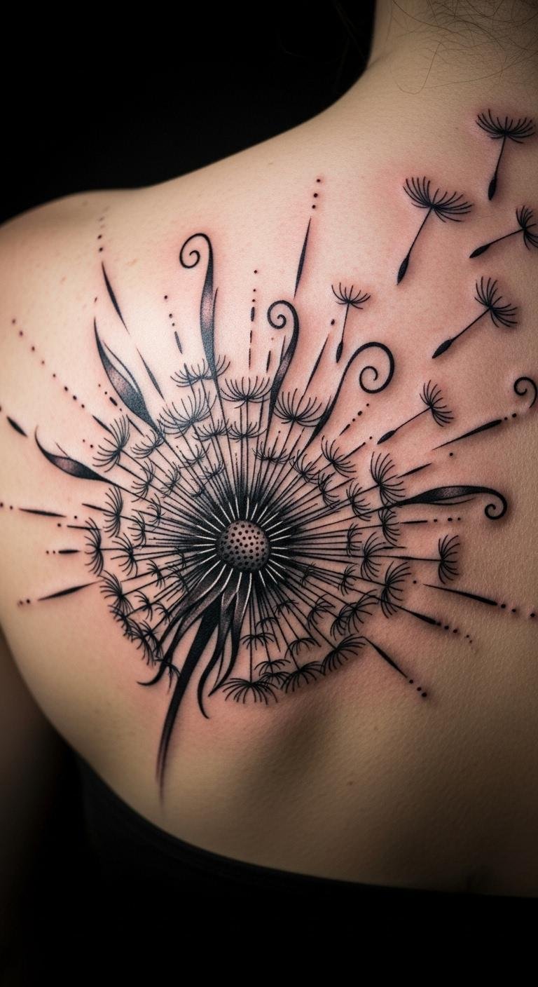 An abstract dandelion burst on the back explodes with freedom energy. Seeds fan out like a starburst. This design covers more space boldly. Doodle bursts on large paper with markers. They cost little and let you play. Free software simulates the effect online. Shops offer deals for $200 larger pieces. Focus on key seeds to save money. Place it high for easy access. This tattoo feels like a big release. Use paint splatters at home for inspiration. It’s a cheap creative boost.
