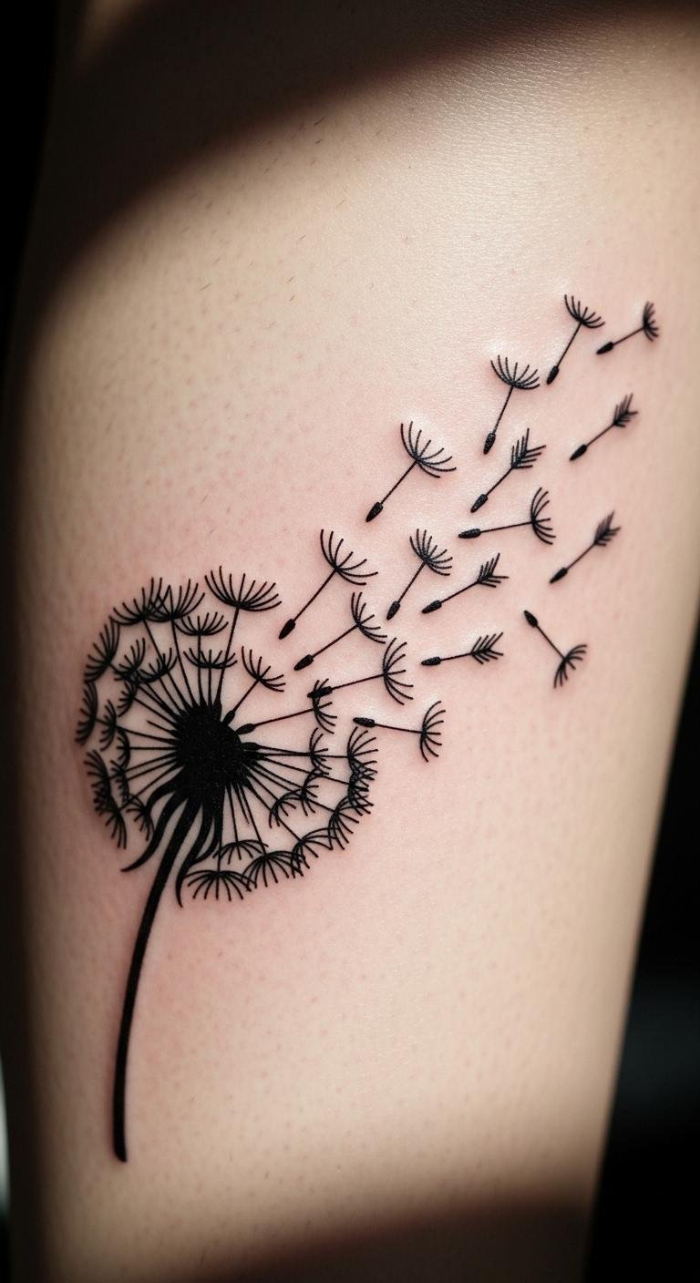 Realistic dandelions on the thigh capture true freedom. Detailed seeds look like the real plant. Practice realism with photos on paper. Free references help. Thigh tattoos hit $140. Focus on key details. This design feels alive. Use plant presses at home for accuracy.