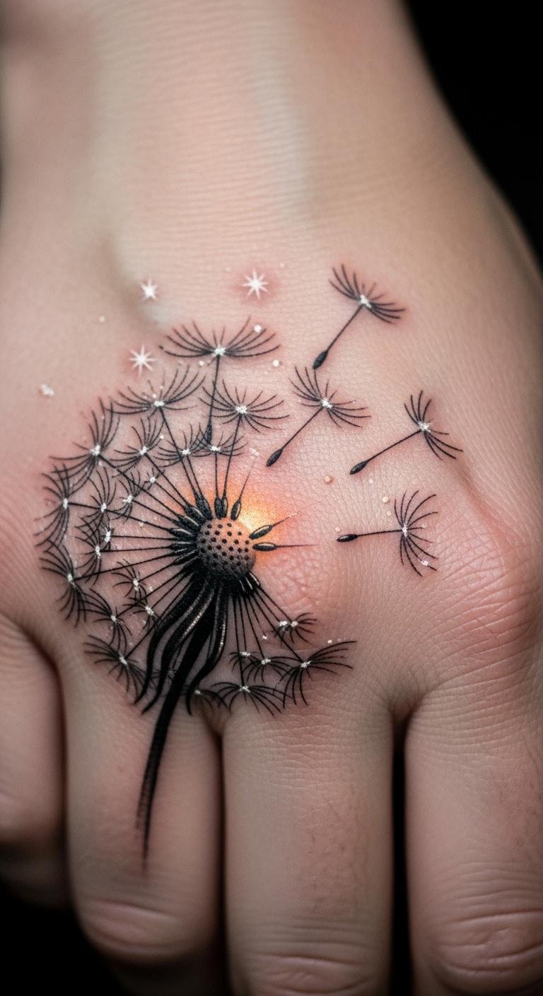Dandelion stars on the hand sparkle with freedom dreams. Stars dot the seeds. Sketch stars with dandelions on paper. Use star stickers. Hand tattoos are $60. Add a few stars. This idea lights your way. Stick stars on hands at home.