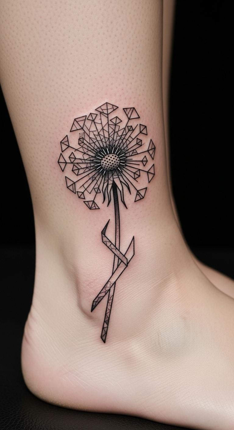 Geometric dandelions on the ankle mix shapes with freedom vibes. Think triangles forming the seeds, pointing to new paths. This style feels modern and grounded. Draw geometric patterns on paper using a ruler. It’s a cheap way to plan. Free apps help create digital versions quickly. Look for artists offering flash designs for $50 or less. Keep it small to fit the ankle. Add dots or lines for extra detail without extra cost. This idea works for daily wear. Practice with string art at home for inspiration. Use household items like string and pins. The tattoo reminds you of structured freedom. Place it low for discreet freedom statements.