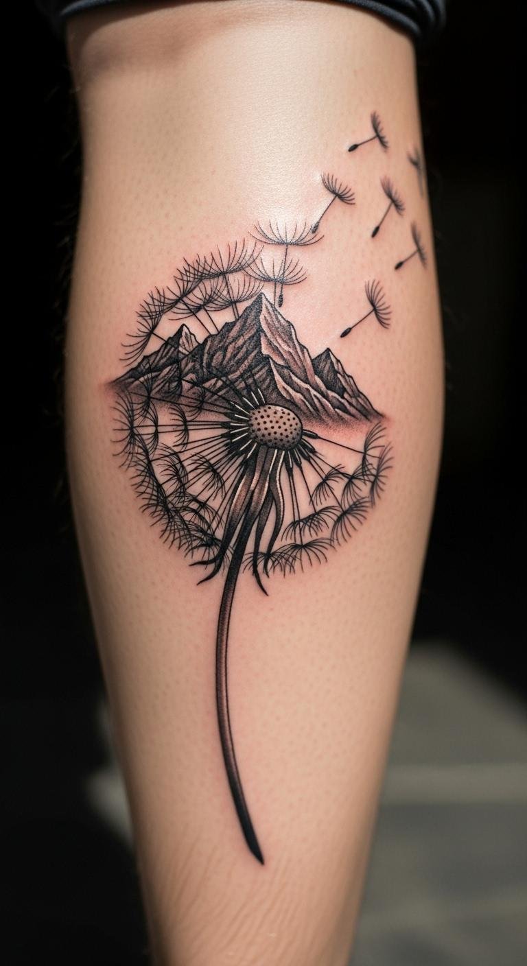 Dandelions with mountains on the calf blend freedom with exploration. Seeds over peaks suggest journeys ahead. Draw simple mountains beside dandelions on paper. Use free landscape templates. Hiking sketches work too. Artists price this at $150. Keep mountains basic to lower costs. Place it on the calf for strength vibes. This idea evokes climbing to freedom. Practice with clay models at home. It’s affordable and fun.