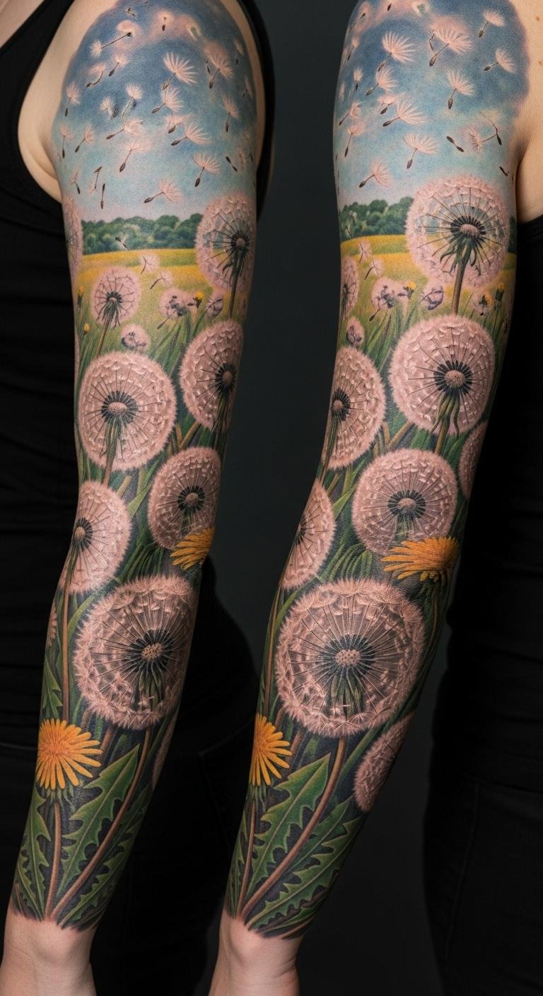 A dandelion field sleeve turns your arm into a freedom landscape. Multiple flowers create a scene. Build it over time to save money. Start with one flower for $100. Sketch fields on paper with crayons. Free apps layer designs easily. Full sleeves might reach $500, but go gradual. Place it for personal viewing. This tattoo immerses you in liberty. Draw on fabric sleeves at home first.