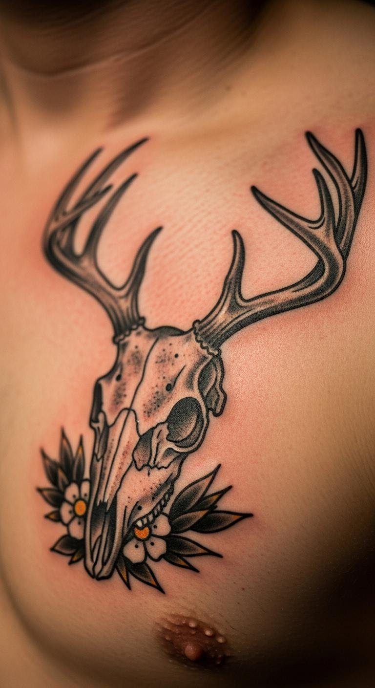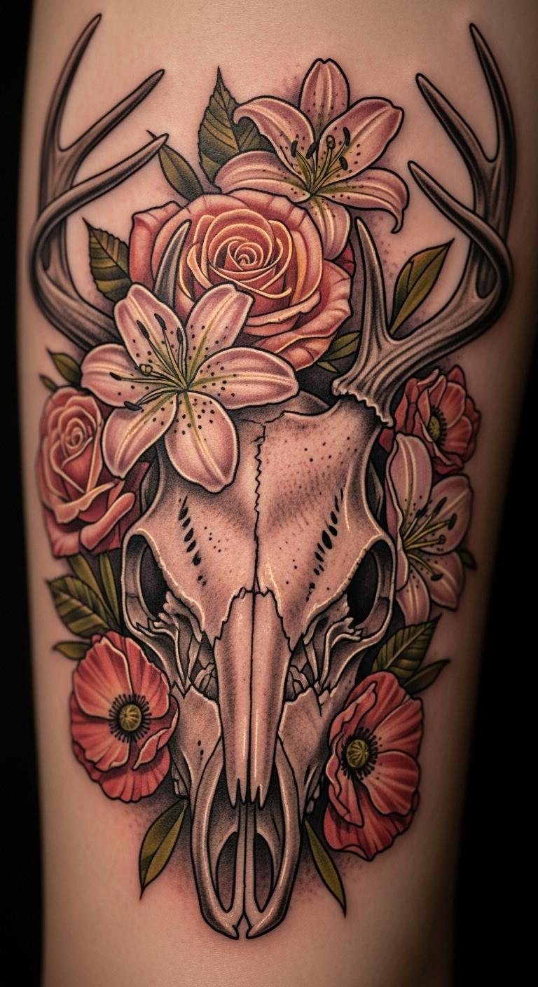 Flowers around a deer skull add a rebirth twist. They mix life with the skull’s deeper side. Grab some flower images online and overlay them on a skull drawing using free software. This helps plan without spending much. Look for budget artists who blend styles for around $150. Flowers symbolize renewal, so think about adding ones you like. Try a temporary tattoo kit at home to experiment—costs less than $10. Place it on your wrist for a quick check. Keep designs simple, like a few petals near the eyes. This makes it affordable and meaningful. Use nature walks for ideas, snapping photos of real flowers. Then, sketch them in. It’s a hands-on way to create something unique. Focus on easy steps to make your tattoo personal.