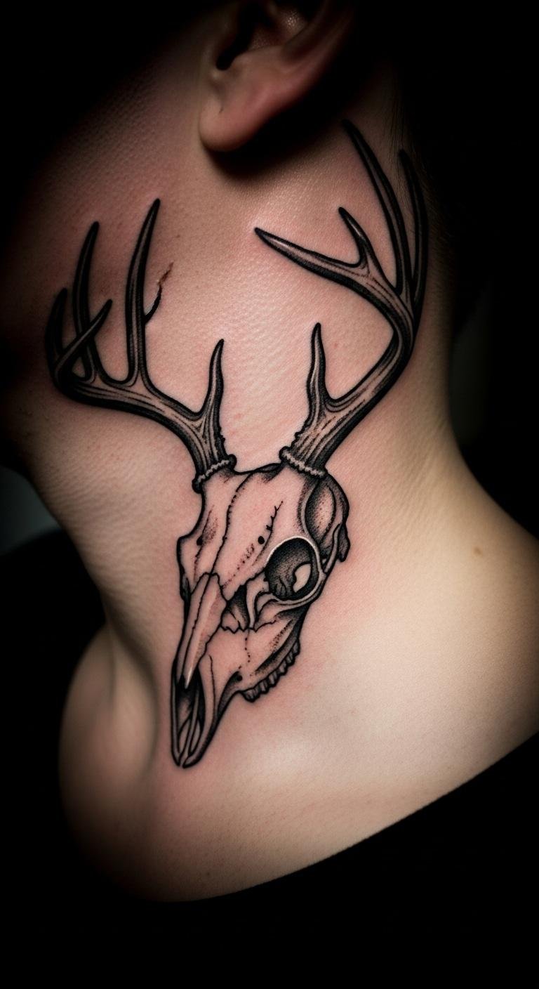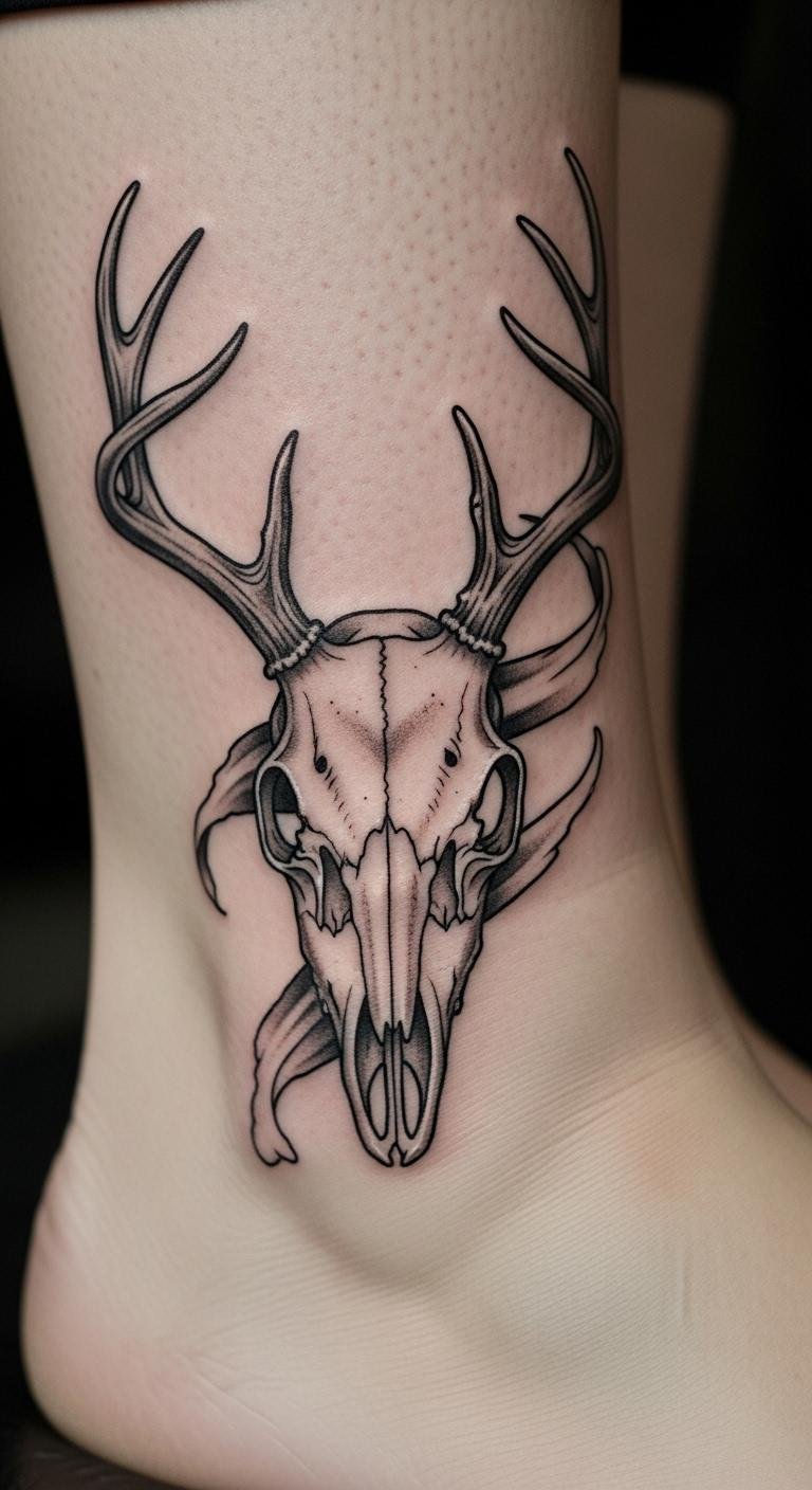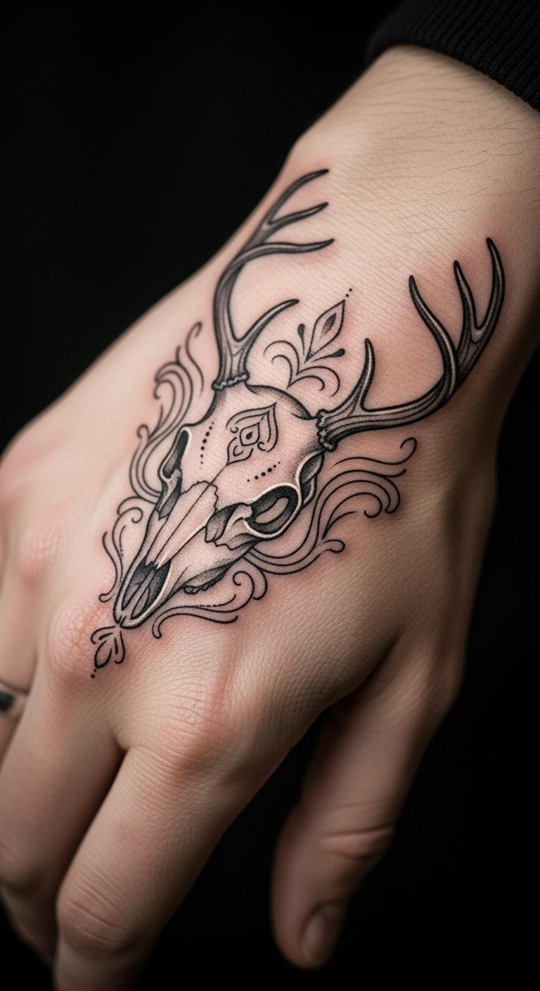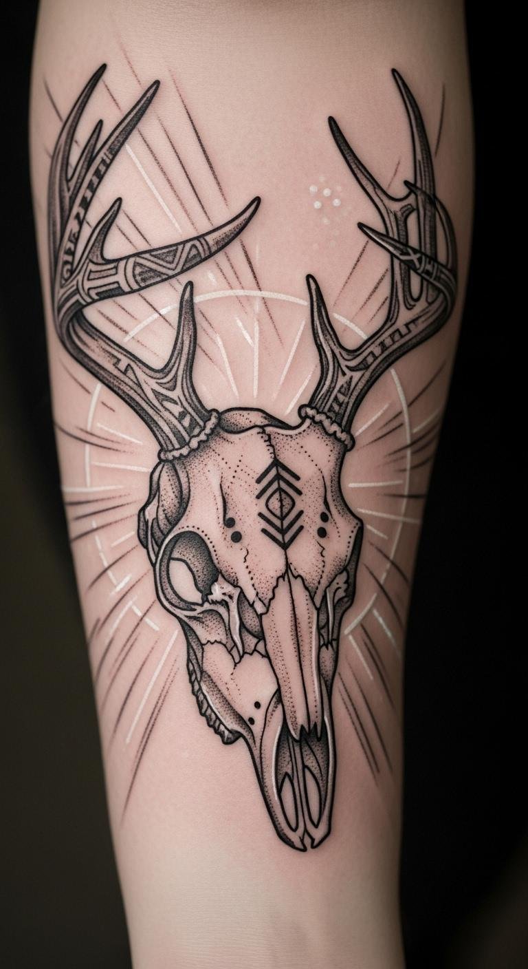 A minimalist deer skull keeps things clean and sharp. It’s great for a subtle edge. Draw a basic outline at home with a pen and paper—free and fast. Use phone apps to refine it before going pro. Find artists who do quick sessions for about $80. Simple lines highlight peace, making it versatile. Test with washable markers on your skin; they’re cheap and easy to find. Put it on your ankle for a hidden spot. Add tiny details like a single antler curve for flair. This approach saves money and time. Look online for free templates to trace. It’s a practical way to customize without hassle. Focus on what feels right for you.
