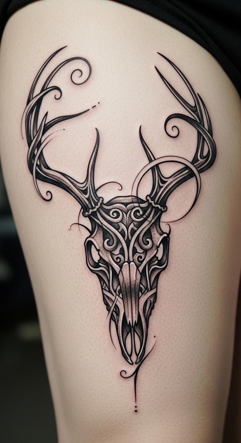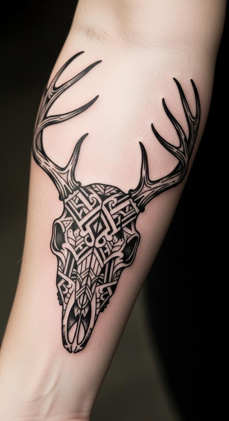 Tribal patterns on a deer skull nod to traditions. They’re bold and rooted. Trace tribal designs on paper; free start. Online resources guide you. Artists charge $115 for this. Tribal motifs connect cultures. Use beads to outline at home; low cost. Position it on your arm for strength. Add key lines only. This keeps it simple. Explore cultural books. It’s a direct way in.