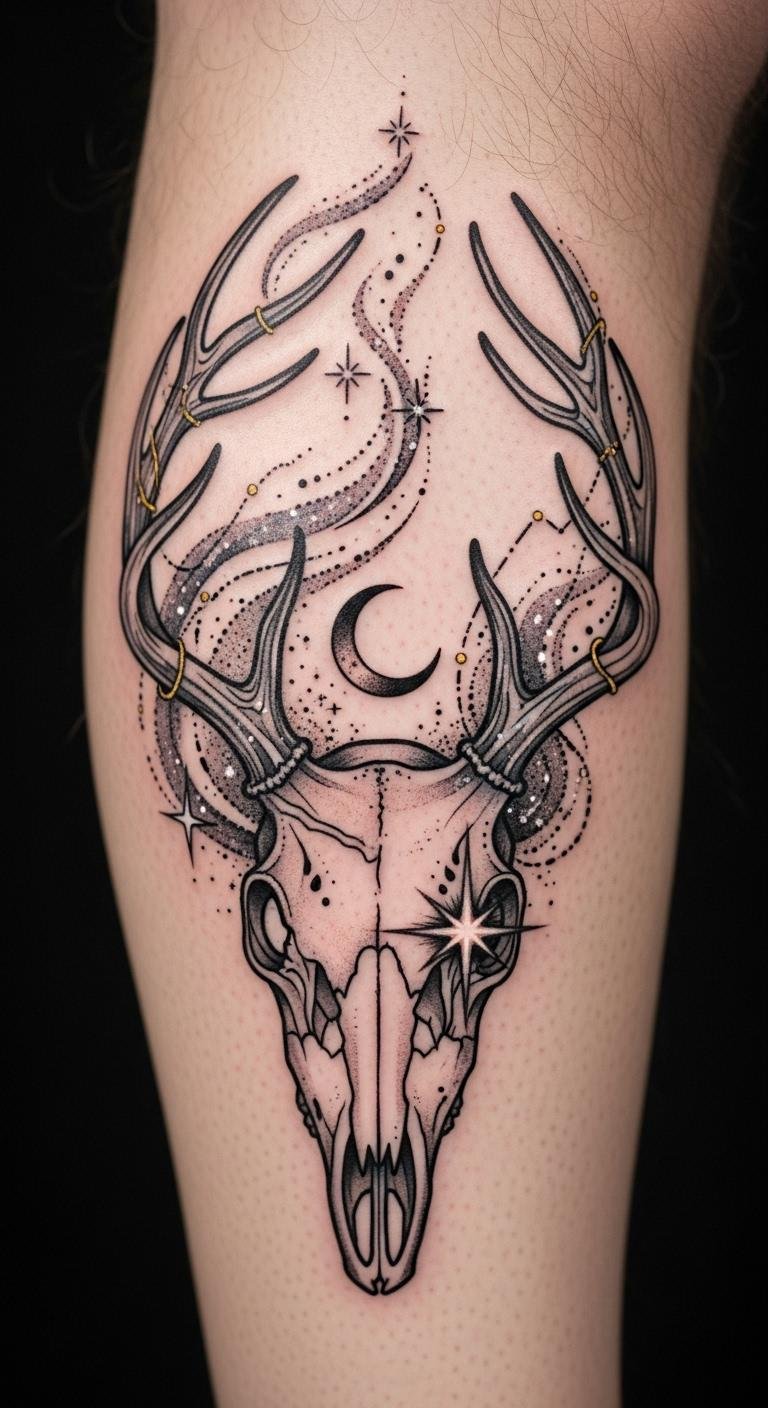 A spiritual deer skull draws from cultural roots. It acts as a personal guide. Research symbols online and jot them down on a notebook—zero cost. Free forums offer design tips. Find a tattoo pro for about $100 who understands these vibes. Cultural symbols add meaning, like ancient patterns. Practice with clay molds at home; kits are under $15. Put it on your chest for a heartfelt spot. Keep designs basic to stay true. This makes it approachable. Draw from books or sites for ideas. It’s a straightforward path to something special.