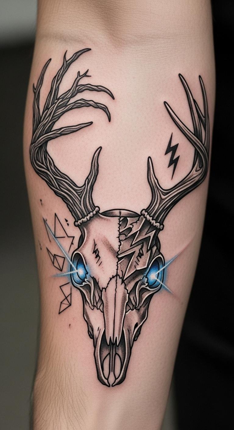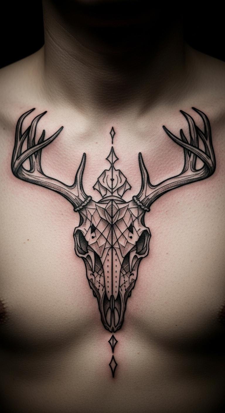 Geometric patterns on a deer skull bring a modern vibe. They mix shapes for a cool look. Start with graph paper and a pencil to sketch triangles around the skull—costs nothing extra. Free design apps can help you play with angles. Book a session with an affordable artist, maybe $120 for this style. Patterns show resilience, adding depth. Use string and pins at home to create mock-ups on paper; it’s a fun, low-cost idea. Place it on your shoulder for balance. Keep lines straight and simple to avoid complexity. This makes the process straightforward. Gather inspiration from everyday objects, like building blocks. It’s an easy way to make your tattoo stand out.