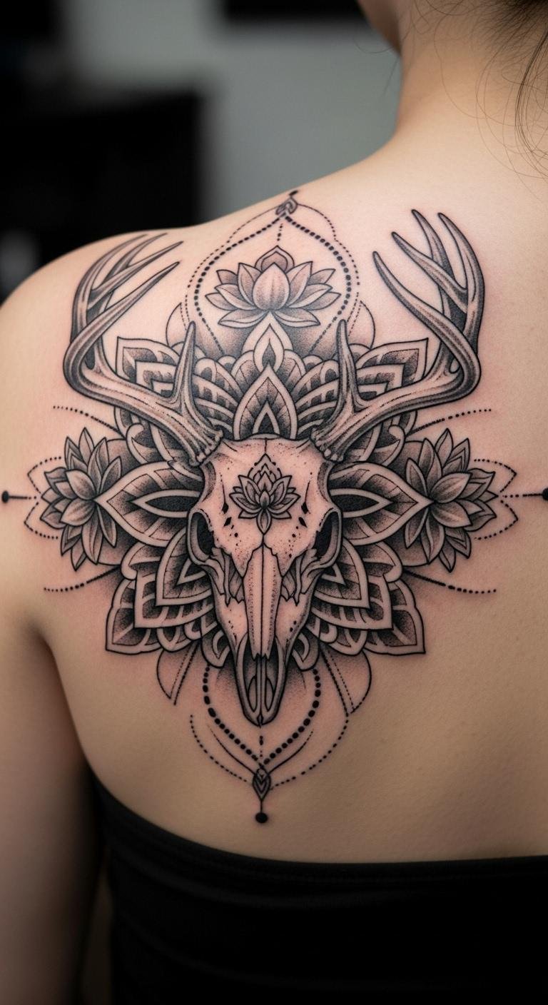 Mandala around a deer skull creates symmetry. It’s balanced and serene. Draw circles on paper; free. Apps perfect the design. Artists charge $110. Mandala patterns offer harmony. Use string for outlines at home; low cost. Place it on your shoulder for fit. Add basic rings. This keeps it accessible. Find mandala templates. It’s straightforward.