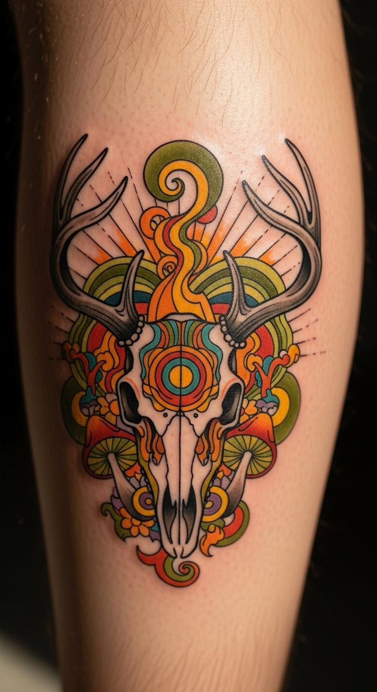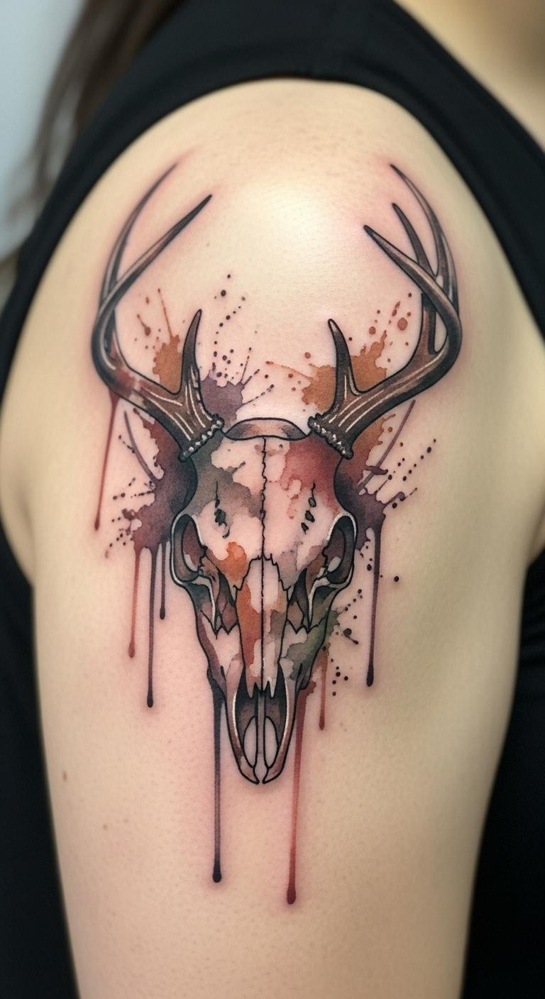 Watercolor effects on a deer skull give an artistic flow. It’s like painting on skin. Experiment with watercolors at home on paper; supplies are cheap. Digital tools let you blend colors online. Artists might do this for $130. Blended shades create renewal feels. Try washable paints on your skin for a trial; under $10. Position it on your side for flow. Focus on soft hues to avoid clutter. This keeps things affordable. Use old brushes for practice. It’s an easy creative step.