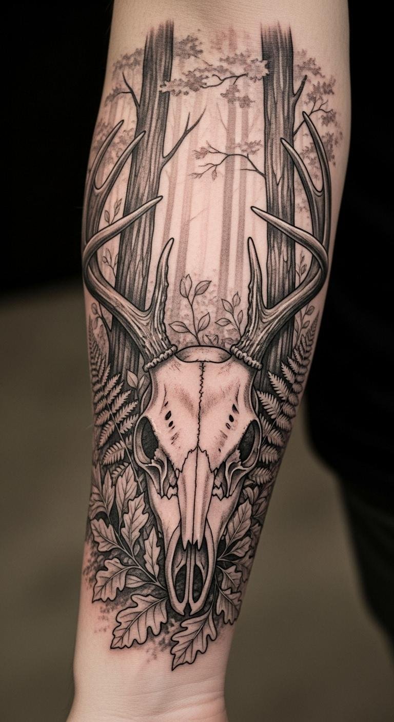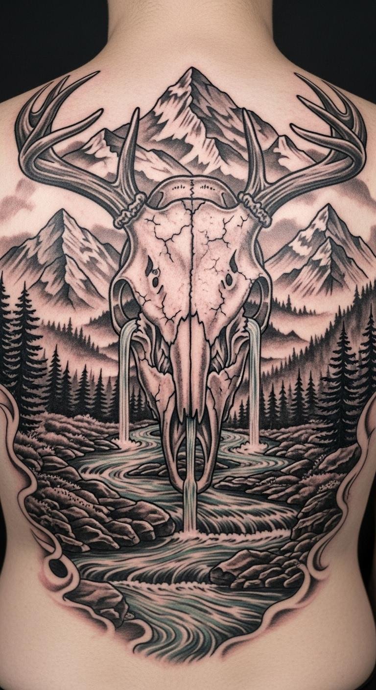 Nature fusion in a deer skull links to landscapes. It’s immersive and real. Trace outdoor elements on paper; free. Photo apps combine them. Artists handle for $140. Nature fusion grounds the design. Use outdoor sketches; no extra cost. Place it on your back for scope. Keep it integrated. This is practical for lovers. Snap local scenes. It’s direct.