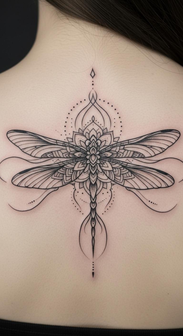 A large back dragonfly makes a big statement. Imagine full wings spanning your upper back. This placement shows strength and growth. Trace large outlines on paper in your room. Download free templates to scale it up. Seek artists with package deals for savings. Include natural elements like leaves for depth. Practice with big sketches using household items. This idea fits those who want a bold tale. Choose this spot for its meaning in personal stories. Break sessions into affordable parts over time.