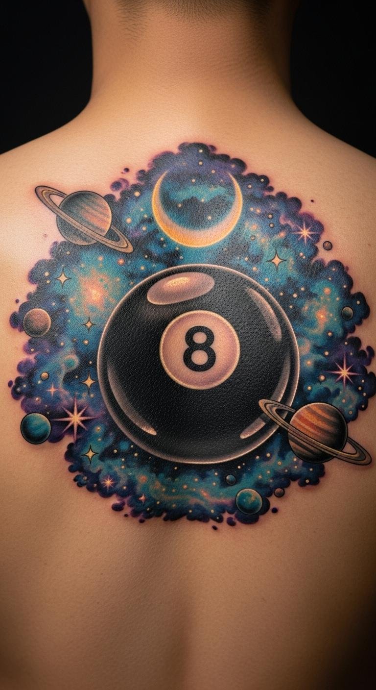 Incorporate planets around your eight ball. It adds cosmic depth. Sketch stars at home. Opt for line work to save. Look for sales. Use trial tattoos. This design inspires daily.