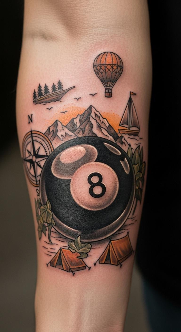 Throw in adventure symbols with your eight ball. It fuels excitement. Plan on apps. Keep it compact. Check for discounts. Try adventure-themed temporaries. This tattoo thrills on a budget.