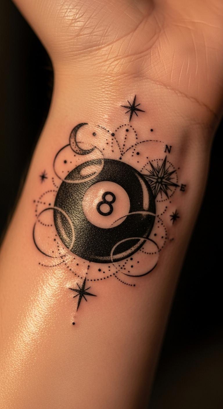 Sprinkle stars around your eight ball for a luck boost. It ties into fate and wonder seamlessly. Draw star shapes at home for practice. Choose simple outlines to cut expenses. Search for budget studios online. Apply fake tattoos to try it out. This idea catches eyes and adds magic to your style. Keep it meaningful yet affordable.