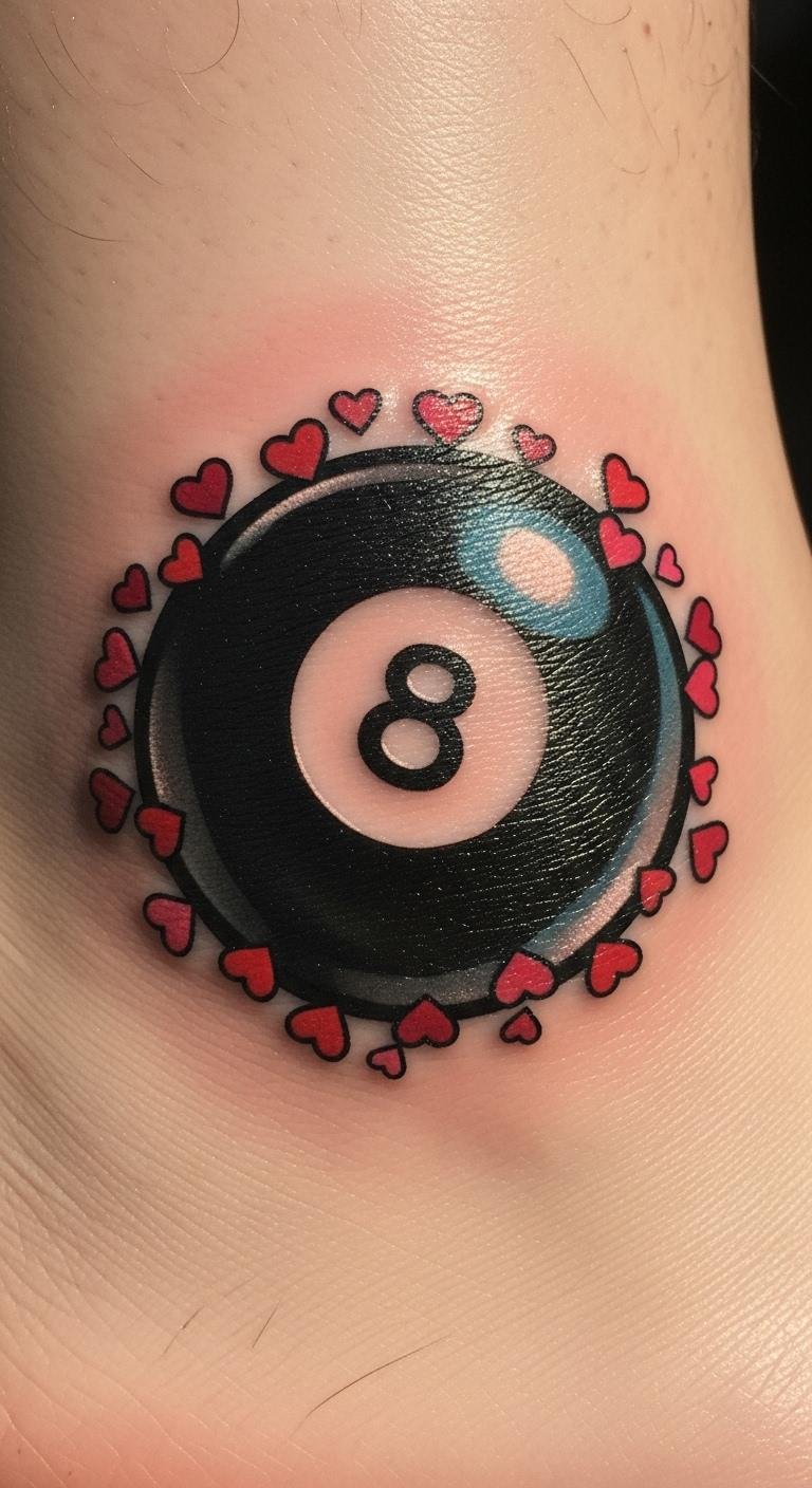 Add hearts to your eight ball for a personal touch. It mixes emotion with chance. Draw hearts on paper to plan. Choose affordable add-ons like this. Seek out sales at tattoo places. Test with temporary options. This idea makes your ink unique and budget-friendly.