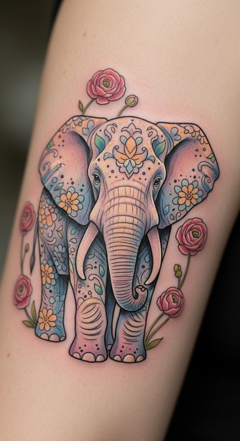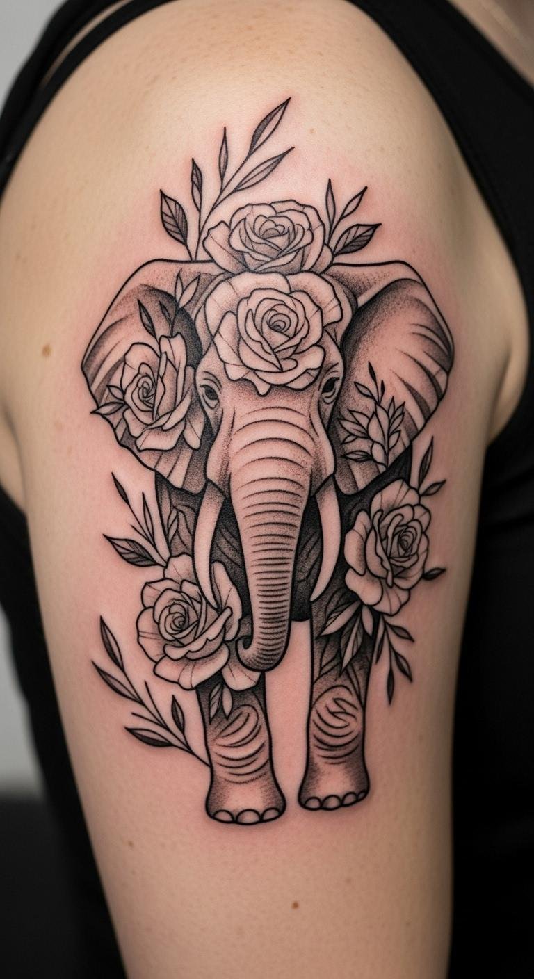Think about a simple black and grey elephant wrapped in roses. This style keeps things understated yet powerful. Start with a basic sketch on paper to visualize it. Use online tools like free drawing apps for your own design tweaks. Save money by visiting local tattoo expos for affordable artists. Add personal touches, like a small rose for a family memory. Bold key elements: roses bring growth vibes. Try practicing with henna kits at home for a test run. Keep the design small for less ink cost. Focus on what matters most to you.