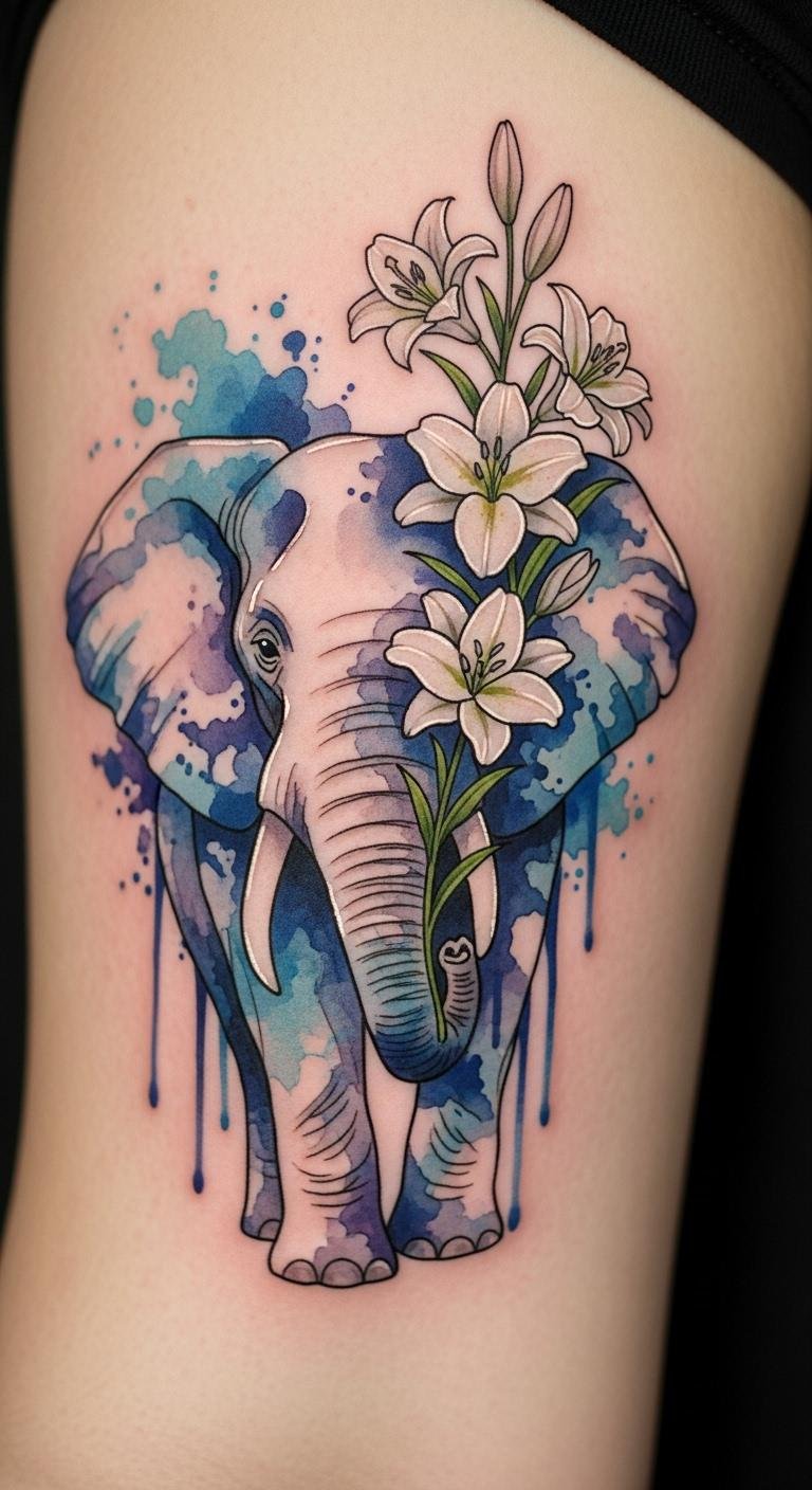 Watercolor styles make elephants pop with soft colors and lilies. Picture bright washes that flow like paint. Grab free templates online to mix in your favorite lilies. Use budget apps to color your ideas digitally. Find deals at community art fairs for artists. Add lilies to symbolize renewal in your life. Bold this: lilies mean fresh starts. Practice with washable markers on your arm first. Go for a smaller size to cut costs. This approach lets you express growth without breaking the bank.