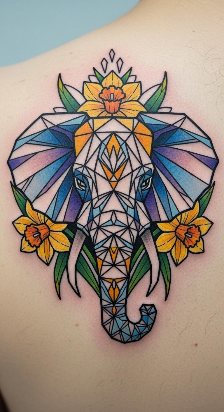 Geometric elephants with daffodils create modern shapes. Think clean lines that pop. Use free geometric apps for planning. Sketch on paper quickly. Look for modern tattoo sales. Daffodils bring hope vibes. Bold this: daffodils mean optimism. Practice with rulers and markers. Pick shoulder for neat, affordable designs. Build your style step by step.