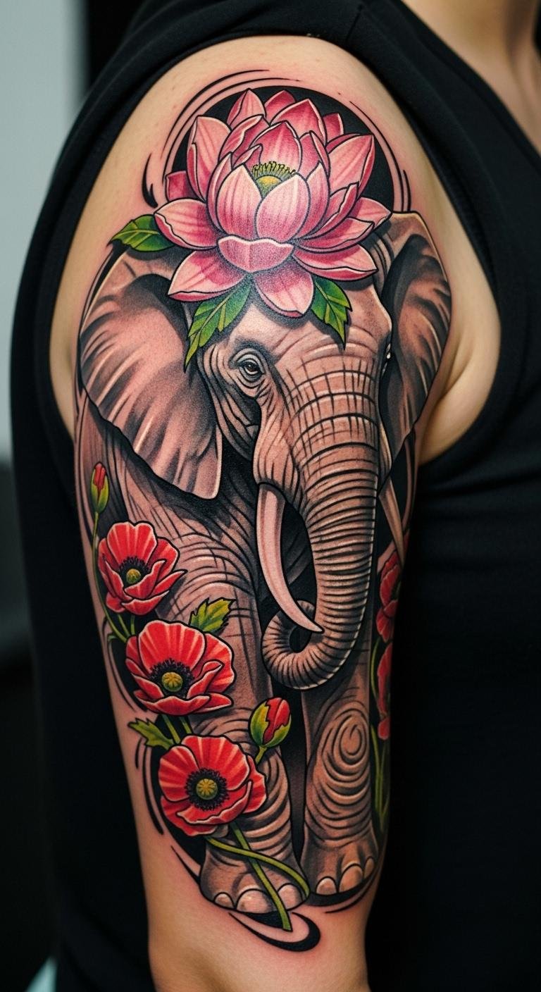 Bold elephants with poppies make a statement. Use strong colors for impact. Search free poppy designs. Doodle with bold markers. Spot bold tattoo promotions. Poppies stand for bravery. Bold this: poppies mean strength. Try with bold stickers. Go for arm for visible, cheap results. Stand out without much spend.