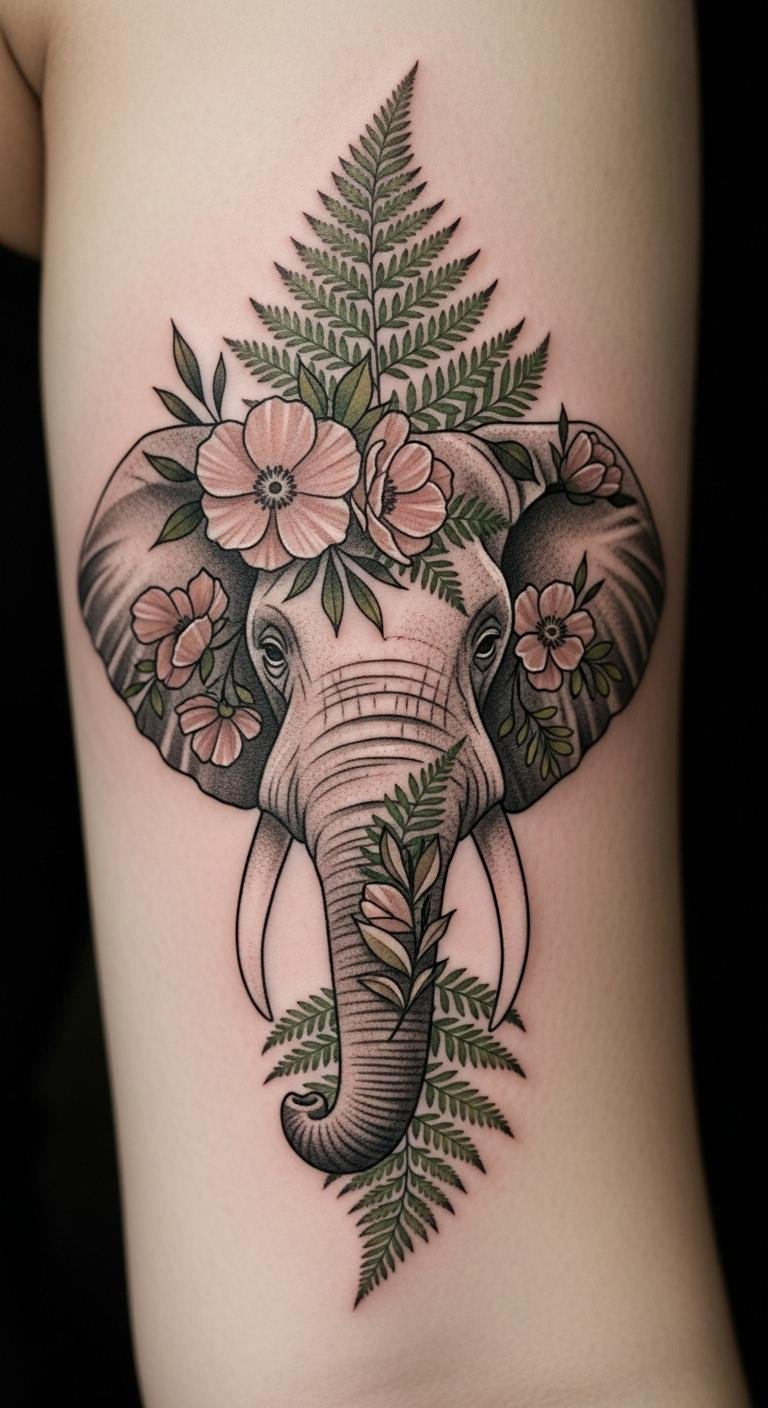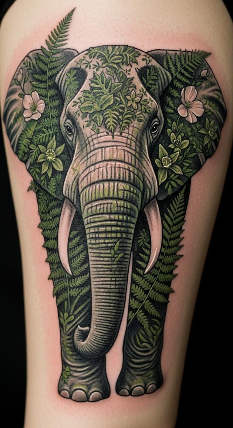 Nature designs blend elephants with ferns for an outdoor feel. Use natural elements wisely. Find free fern images. Sketch outdoors with ease. Check nature tattoo groups for sales. Ferns mean protection. Bold key element: ferns mean safety. Try with leaf rubbings. Place on thigh for natural, low-cost vibes. Connect with the wild.