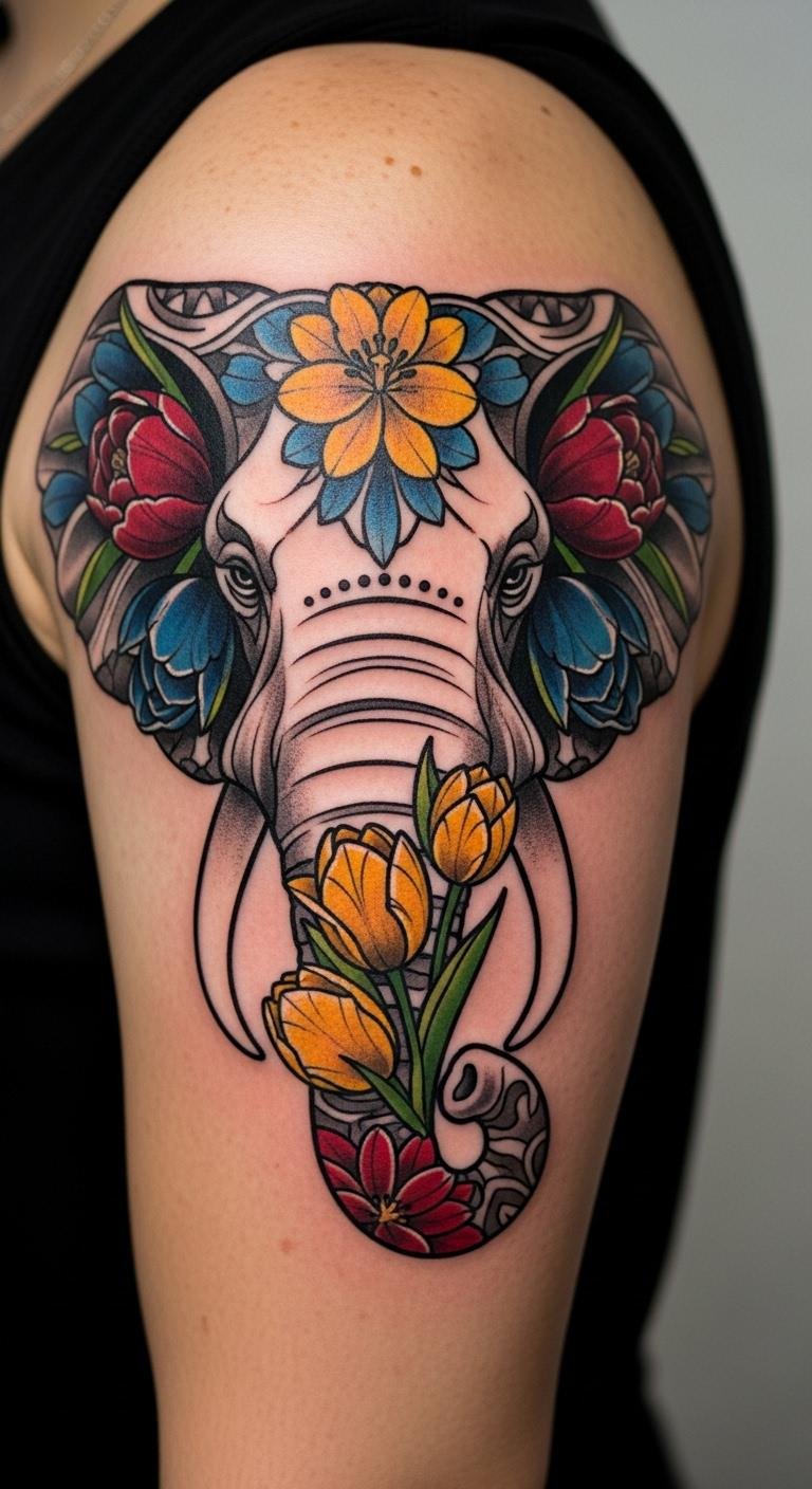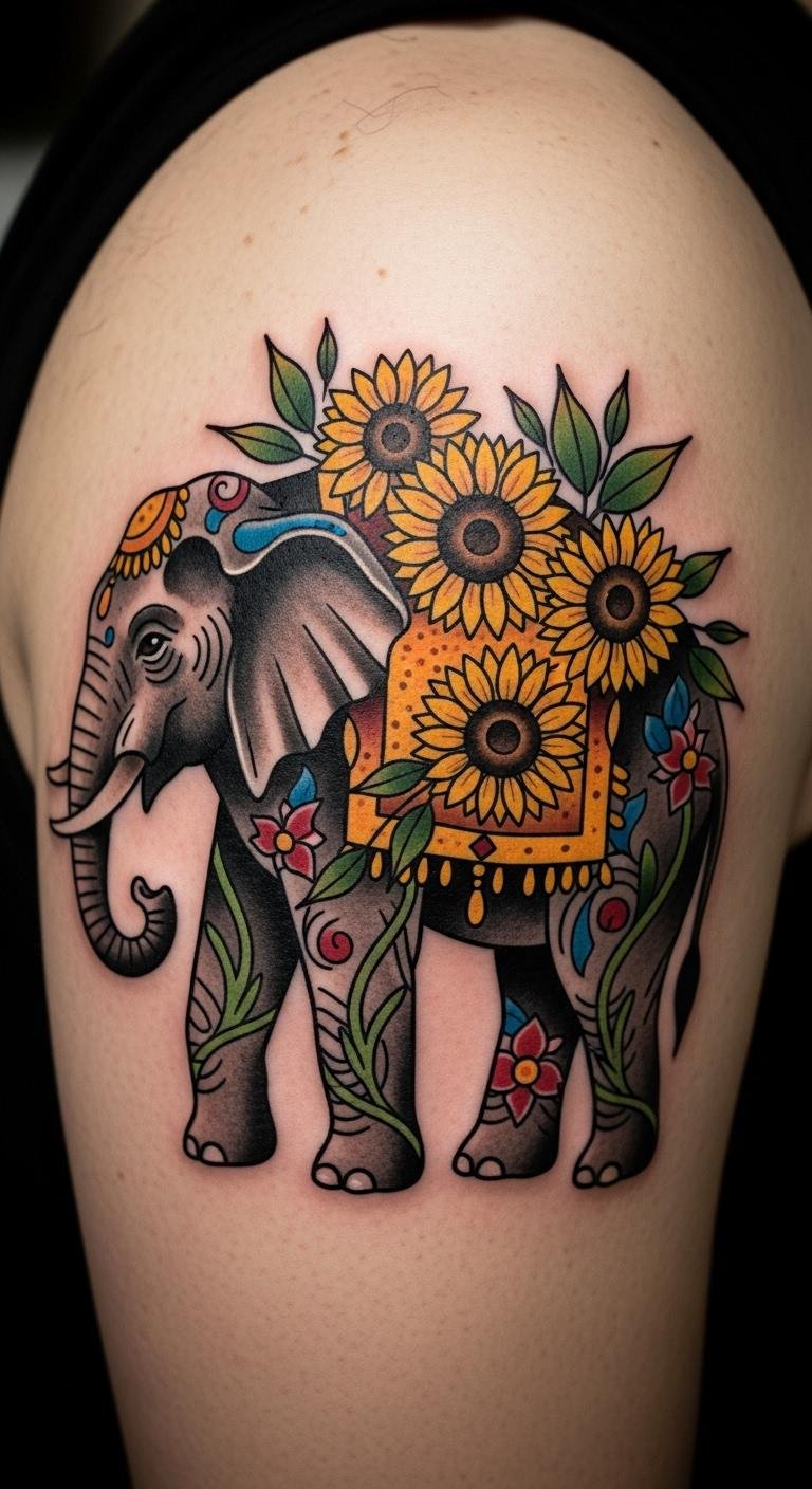 Neo-traditional designs give elephants a bold, vintage twist with sunflowers. Imagine thick outlines and cheerful colors. Draw it out with basic pencils at home. Search free stock sites for sunflower inspirations. Check local shops for flash sales to save. Use sunflowers to nod to happy times. Bold key part: sunflowers stand for joy. Test with temporary tattoos from dollar stores. Opt for arm spots for easier sessions. Keep it fun and meaningful on a budget.