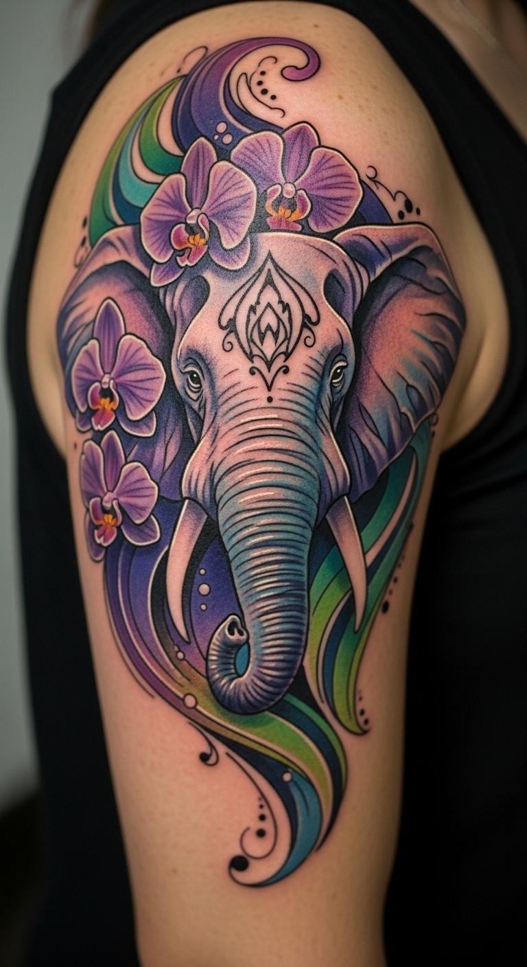 Artistic elephants with orchids spark creativity. Let art guide you. Grab free artistic tools. Doodle with creative flair. Check art tattoo shops. Orchids mean expression. Bold key element: orchids mean art. Test with artistic paints. Choose back for expressive, budget ink. Create your vision.