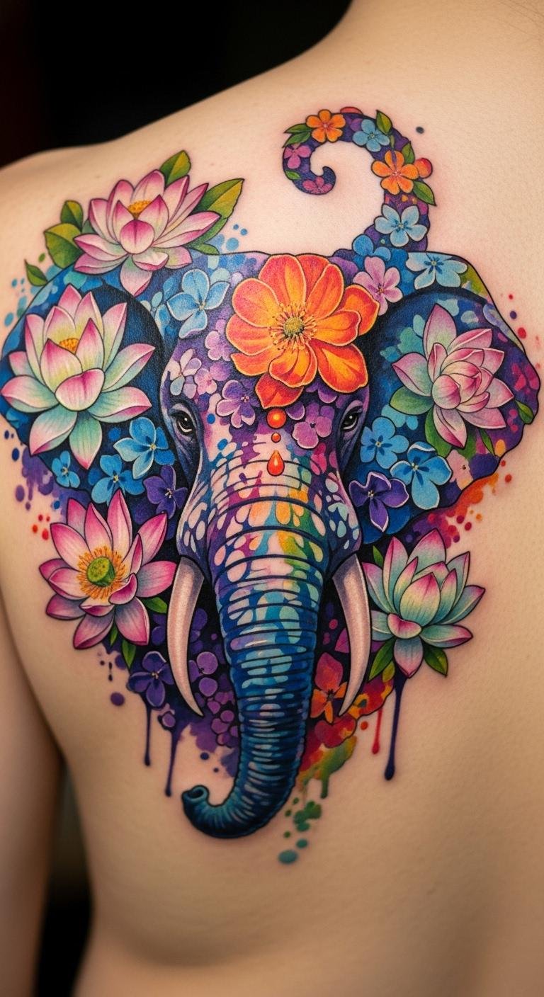 2. Vibrant Watercolor Elephant and Lilies