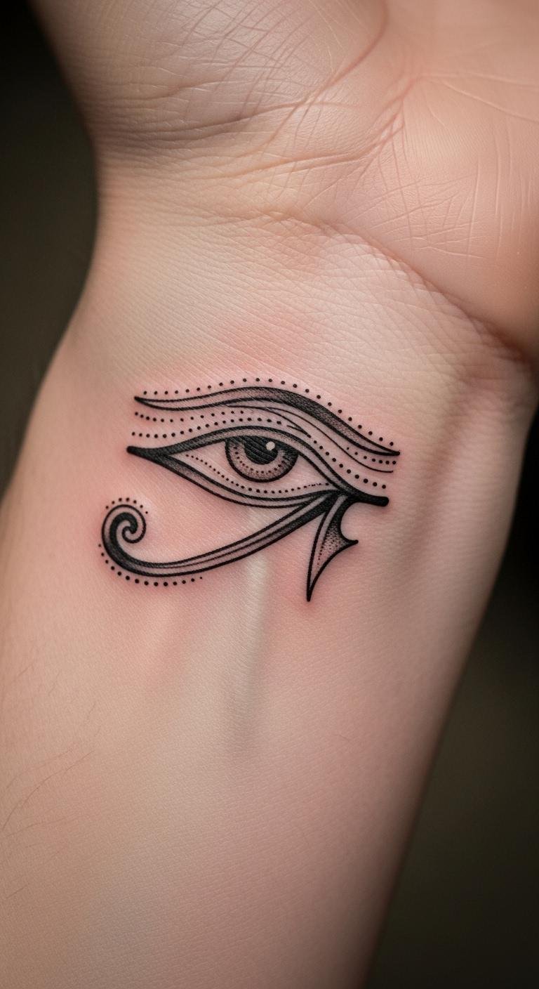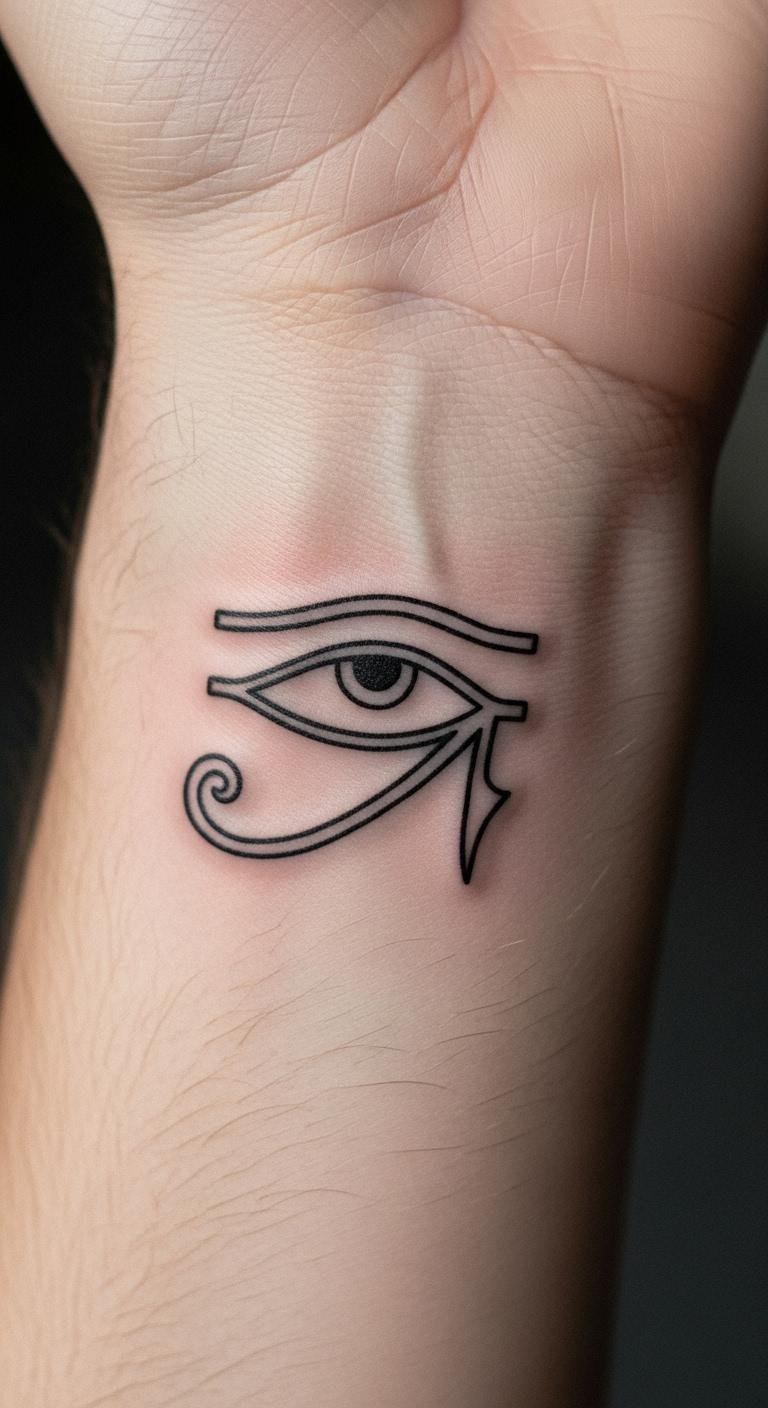 Picture a sleek, simple Eye of Horus on your wrist. This design uses just a few lines to capture the eye’s shape. It fits small spaces and reminds you of protection all day. Start with a sketch on paper to plan it. Use a temporary tattoo kit from a dollar store for testing. Choose black ink for a classic look. Keep costs low by visiting a local artist during off-peak hours. Add a personal twist, like a small dot for balance. This spot boosts confidence during handshakes or daily tasks. Try it yourself: Draw the symbol with a fine-tip pen on your skin first. Pick a spot that shows when you need a quick lift.