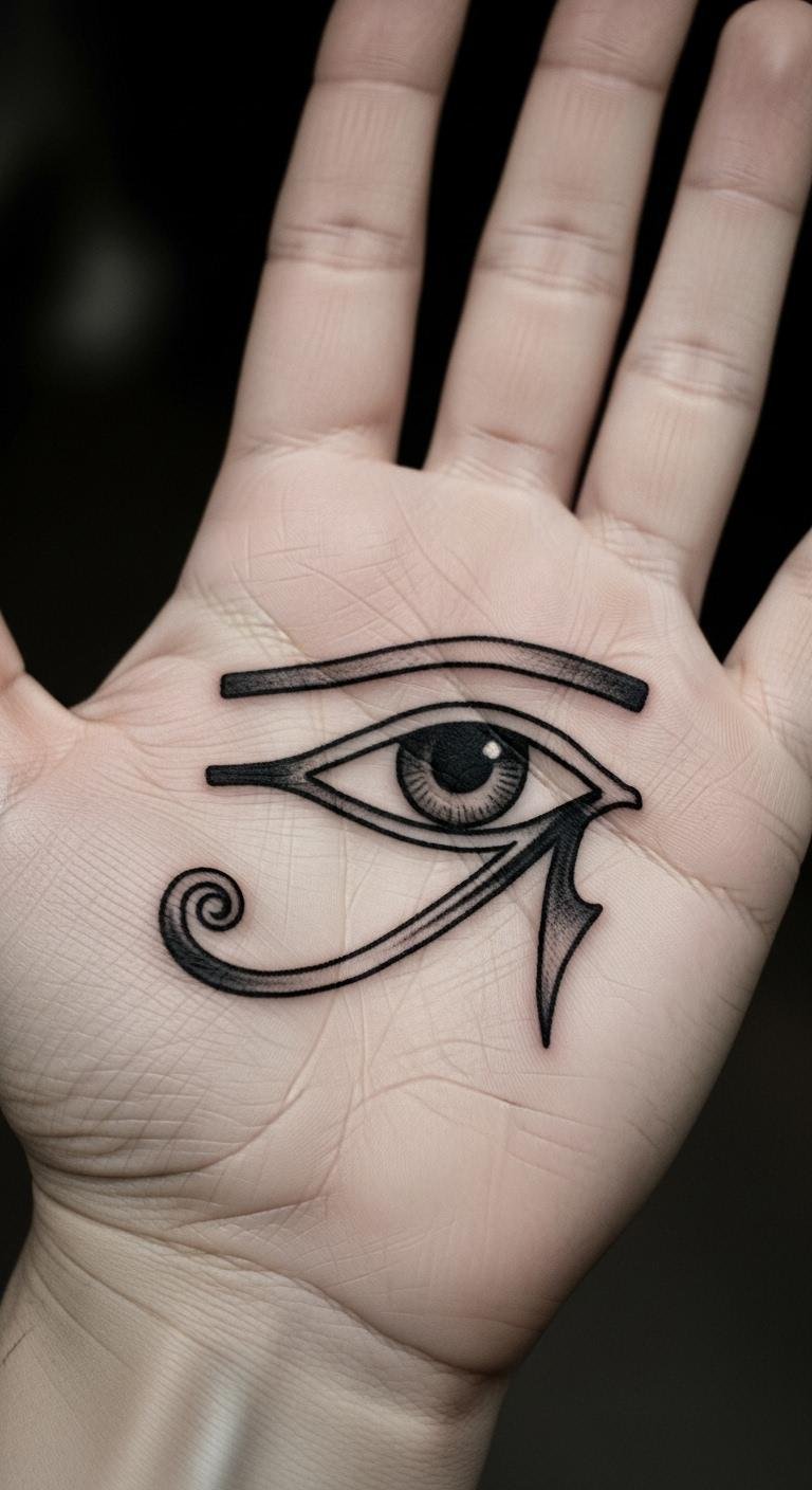 Hide the Eye of Horus on your palm for secret confidence. This placement reveals it only when you choose. Trace on your hand with a pen. Use palm stickers from online for tests. Go minimal to cut costs. Find quick hand sessions at studios. Add a curve for personalization. It surprises you during grips. Affordable idea: Use hand lotion with drawn designs. This tattoo offers private power.