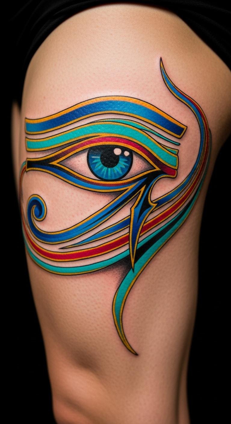 Splash color on the Eye of Horus on your thigh for fun energy. This area lets you express boldly. Color in sketches with crayons first. Try thigh wraps with patterns. Limit shades for budget. Check for color specials at shops. Mix in a flower for you. It lifts confidence in private views. Home hack: Paint on with body-safe colors. This design sparks daily joy.