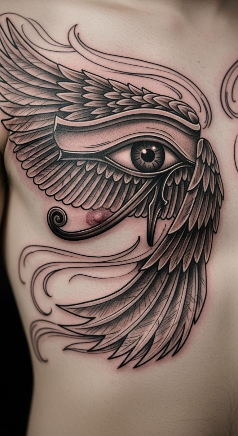 Add wings to the Eye of Horus on your ribs for flight-like confidence. This design flows with your body. Draw on your side with markers. Use rib cage templates for practice. Keep it simple for savings. Search local deals for body art. Personalize with feather tips. It inspires during breaths. Try easily: Trace on clothing. This tattoo gives a sense of freedom.