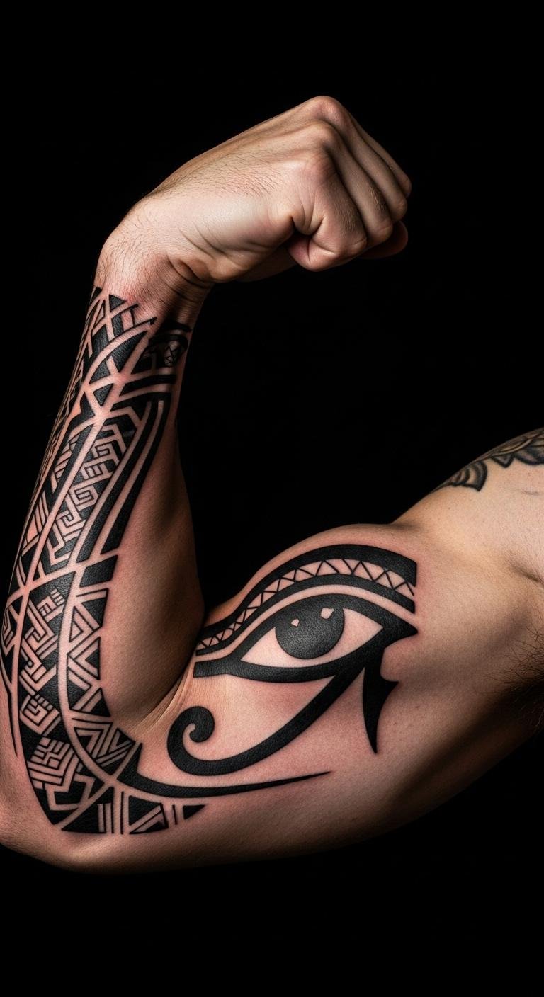 Blend tribal elements with the Eye of Horus on your bicep for tough confidence. This spot highlights your strength. Sketch patterns on paper. Use arm sleeves for trials. Stick to outlines for cost. Find bicep specials nearby. Add waves for your style. It empowers workouts. DIY option: Draw on with athletic tape. This design builds physical pride.