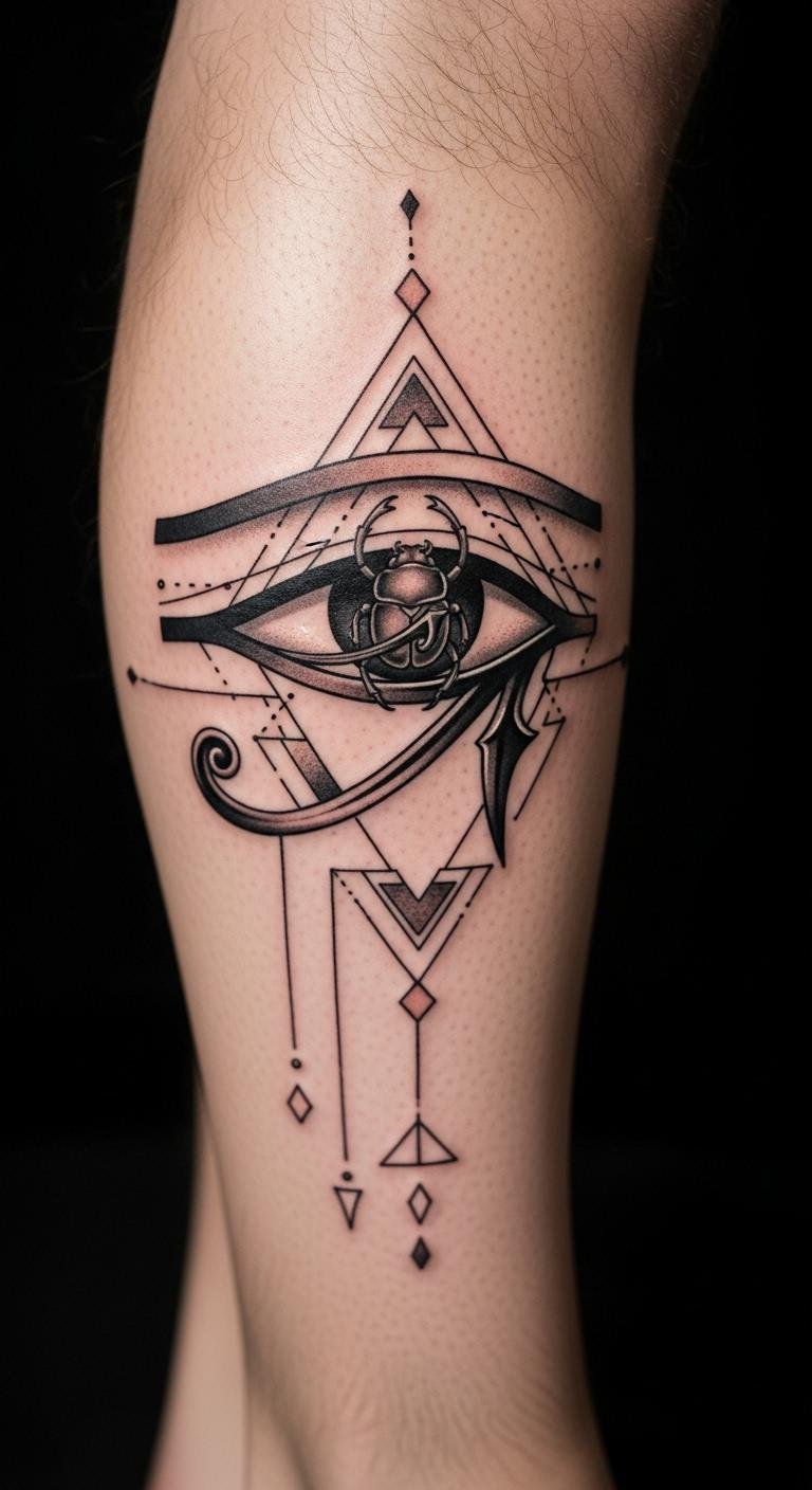 Pair the Eye of Horus with a scarab on your leg for renewal vibes. This combo tells a story of growth. Plan on paper with both elements. Use leg wraps for practice. Keep lines basic. Check for pairing discounts. Add a link for you. It boosts leg confidence. At-home idea: Draw on pants. This design renews your spirit.