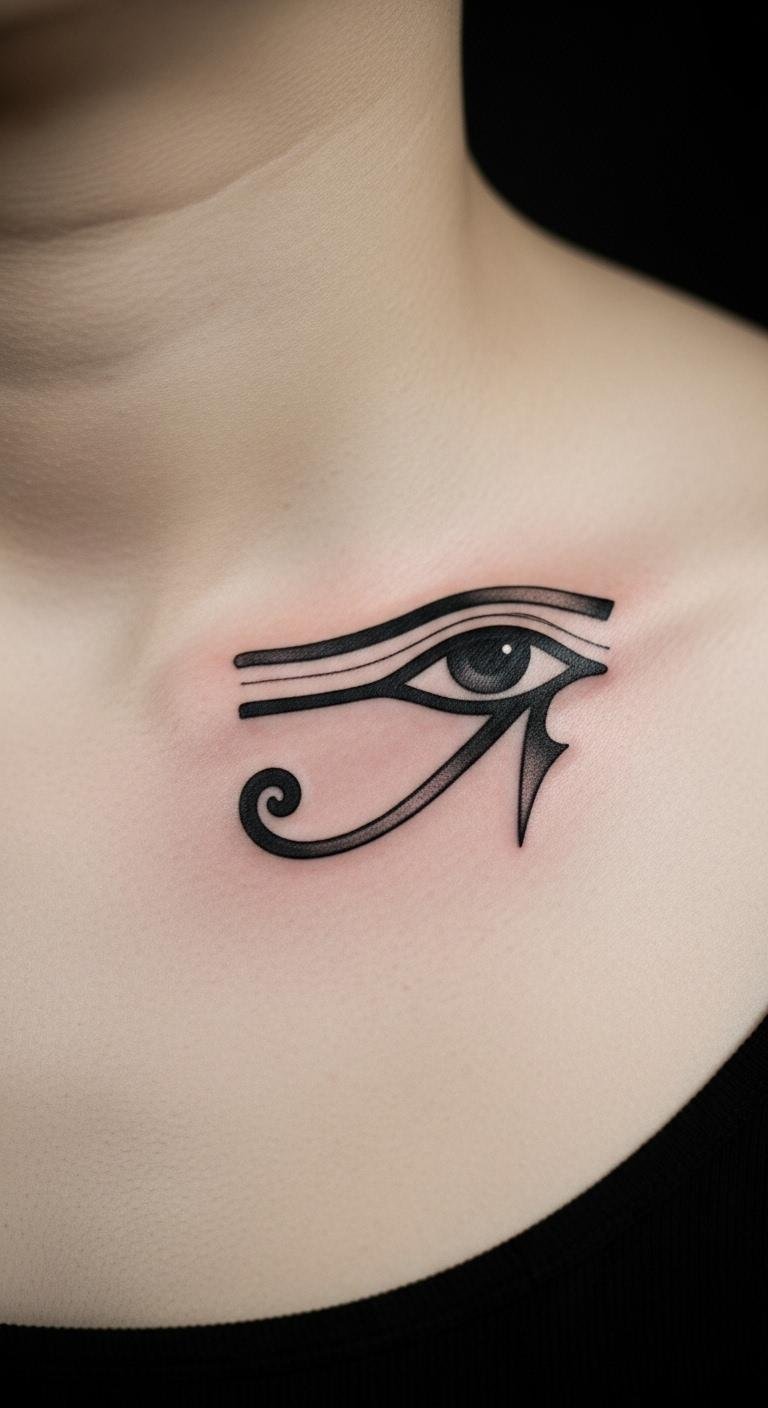 Curve the Eye of Horus on your collarbone for elegant confidence. This spot frames your presence. Sketch on your chest area. Try collar accessories for tests. Go with flowing lines. Find bone-specific deals. Personalize with a swirl. It enhances outfits. Easy start: Use necklaces with similar shapes. This tattoo adds grace.