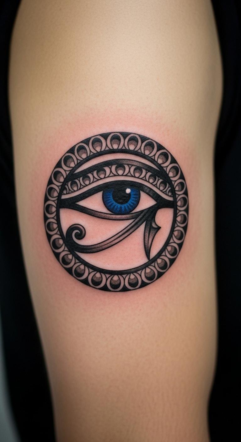 Make the Eye of Horus circular on your upper arm for unity. This design circles confidence around you. Draw circles on paper. Use arm bands for previews. Limit to one shape. Look for arm offers. Add a ring for meaning. It circles strength. Budget tip: Trace with round objects. This tattoo unifies your energy.