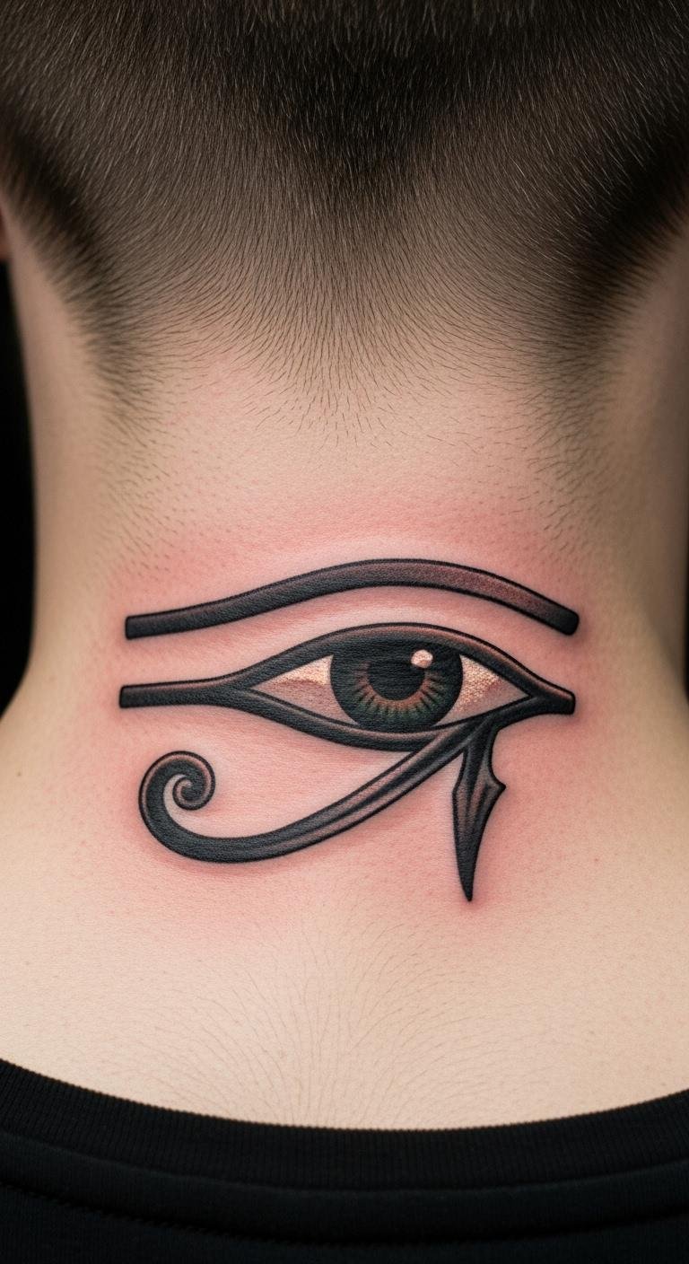 Put the Eye of Horus on the back of your neck for shield-like confidence. This area guards your thoughts. Draw on your neck with markers. Try neck patches. Use straight lines. Find quick neck sessions. Customize with a guard. It protects daily. Home practice: Use bandages with designs. This tattoo shields you.