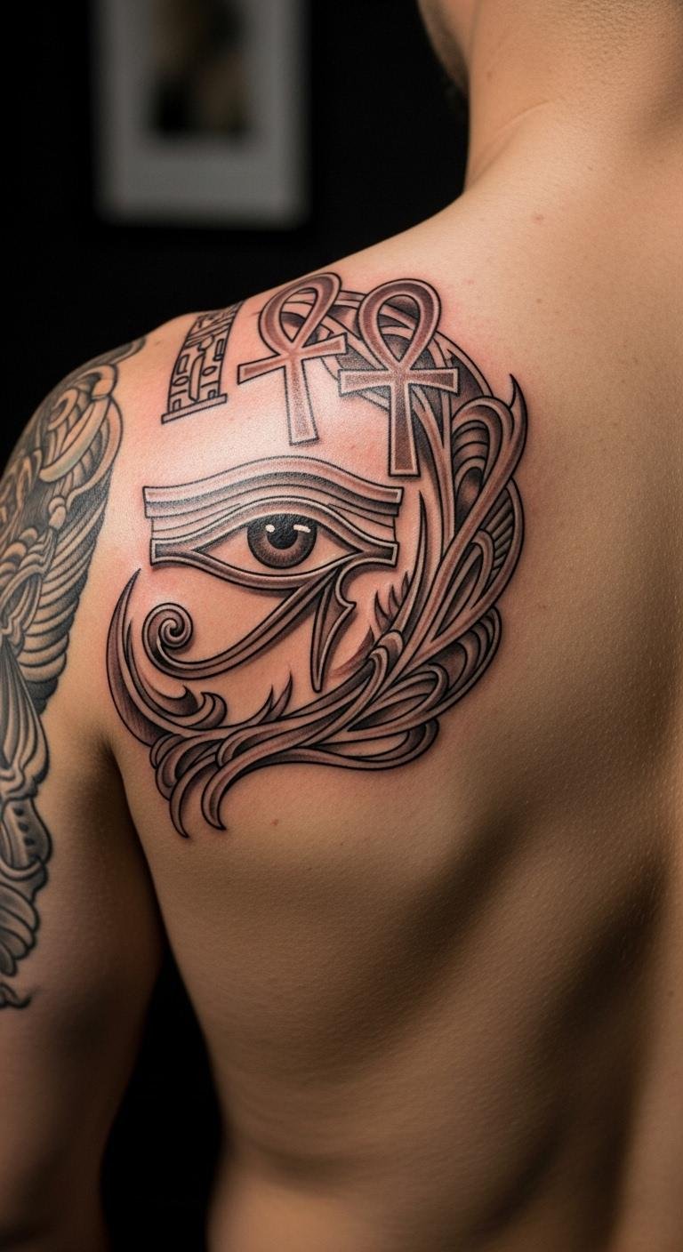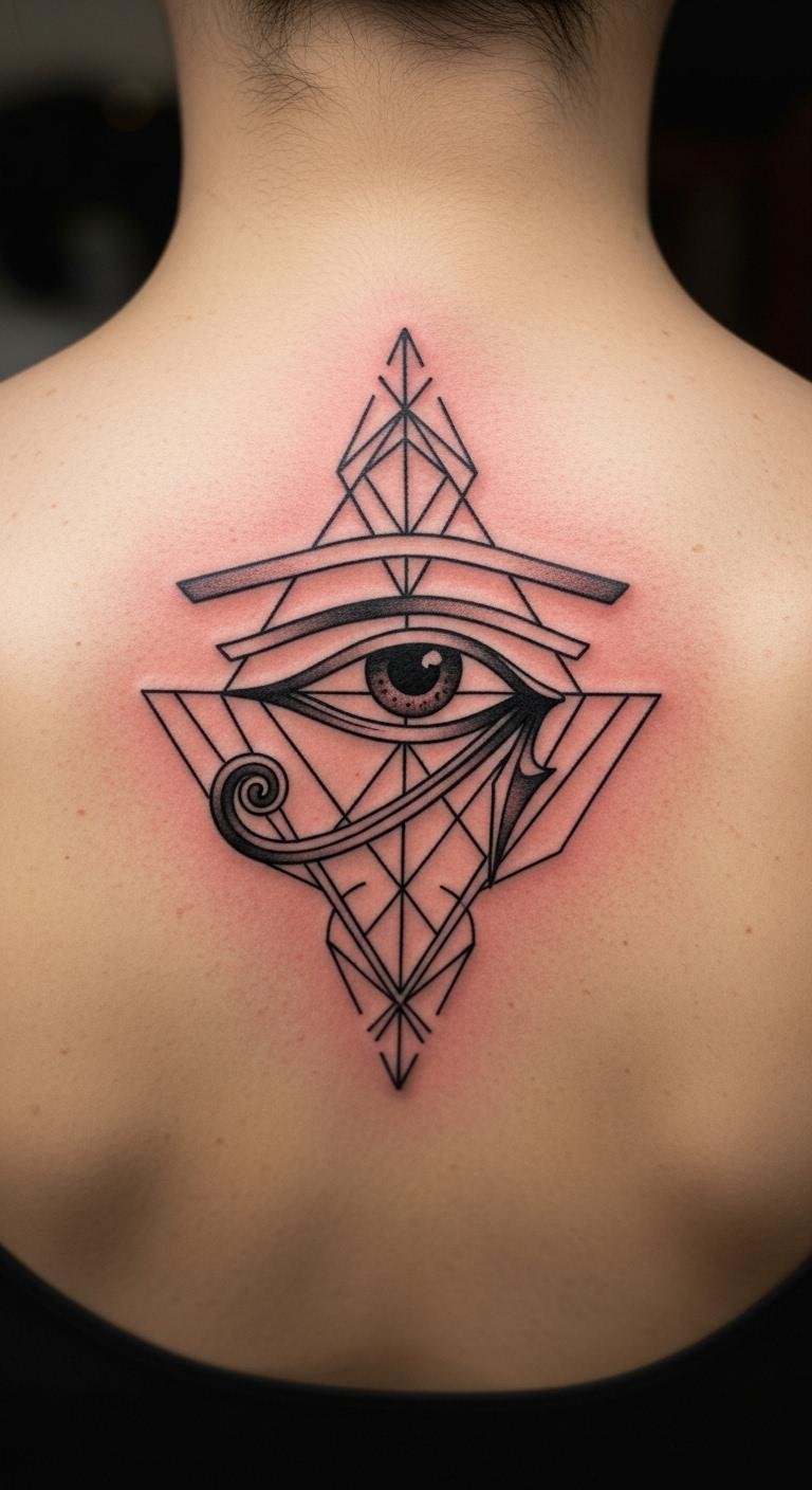 Mix geometry with the Eye of Horus on your back for a modern edge. This setup creates a web of shapes that symbolize stability. Sketch ideas on graph paper to get the angles right. Use free apps on your phone to design digitally first. Stick to basic lines to keep it budget-friendly. Find a nearby artist who does walk-ins for lower prices. Add triangles for a personal touch. It stays hidden yet empowers you during tough moments. Do it affordably: Trace the design with string on your body before committing. This tattoo turns your back into a canvas of quiet strength.