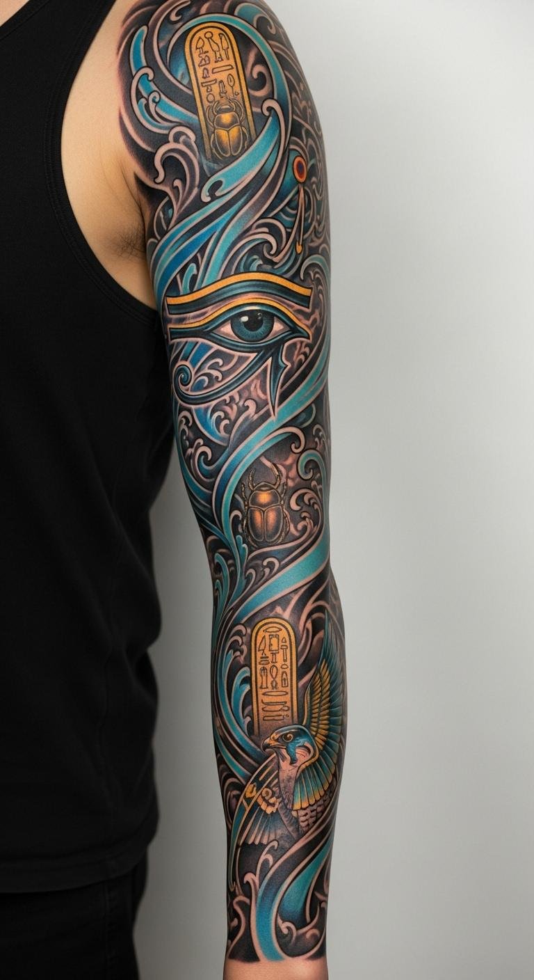 Integrate the Eye of Horus into a full arm design for total confidence. This flows with your limb. Plan the whole arm. Use arm sleeves for tests. Build gradually. Look for session packages. Add flows for you. It covers you in strength. Step-by-step: Add pieces over time. This design envelops your power.