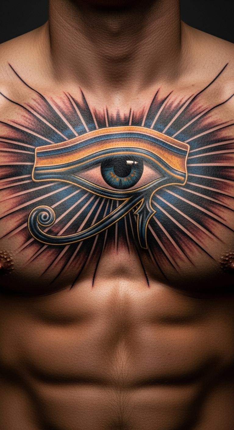 Extend rays from the Eye of Horus on your chest for outward confidence. This design beams energy. Draw rays on paper. Try chest stickers. Use extending lines. Find ray specials. Personalize with beams. It radiates assurance. Affordable build: Add rays in stages. This tattoo shines bright.