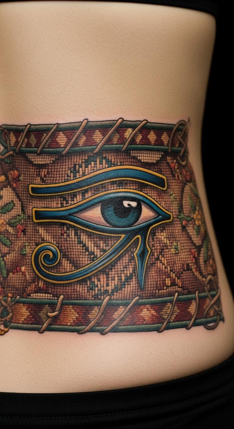 Weave the Eye of Horus into a lower back tapestry for woven confidence. This area tells a full story. Sketch the weave. Use back wraps. Layer simply. Check for back deals. Add threads for you. It weaves security. Creative tip: Use fabric for practice. This design holds you together.