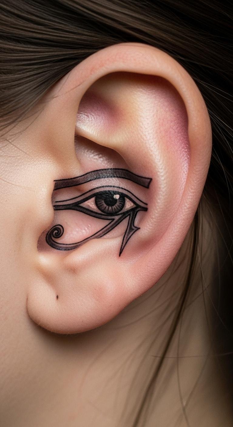 Tuck a tiny Eye of Horus behind your ear for subtle confidence. This spot keeps it discreet but always near your thoughts. Draw a thumbnail sketch on paper to perfect the size. Try stick-on tattoos from a pharmacy for a trial run. Go with fine lines to avoid extra costs. Local studios often have quick sessions for small pieces. Customize it with a dot for your own story. It whispers reminders during conversations. Keep it simple: Use a henna kit at home to test the spot. This design makes you feel protected in everyday interactions.