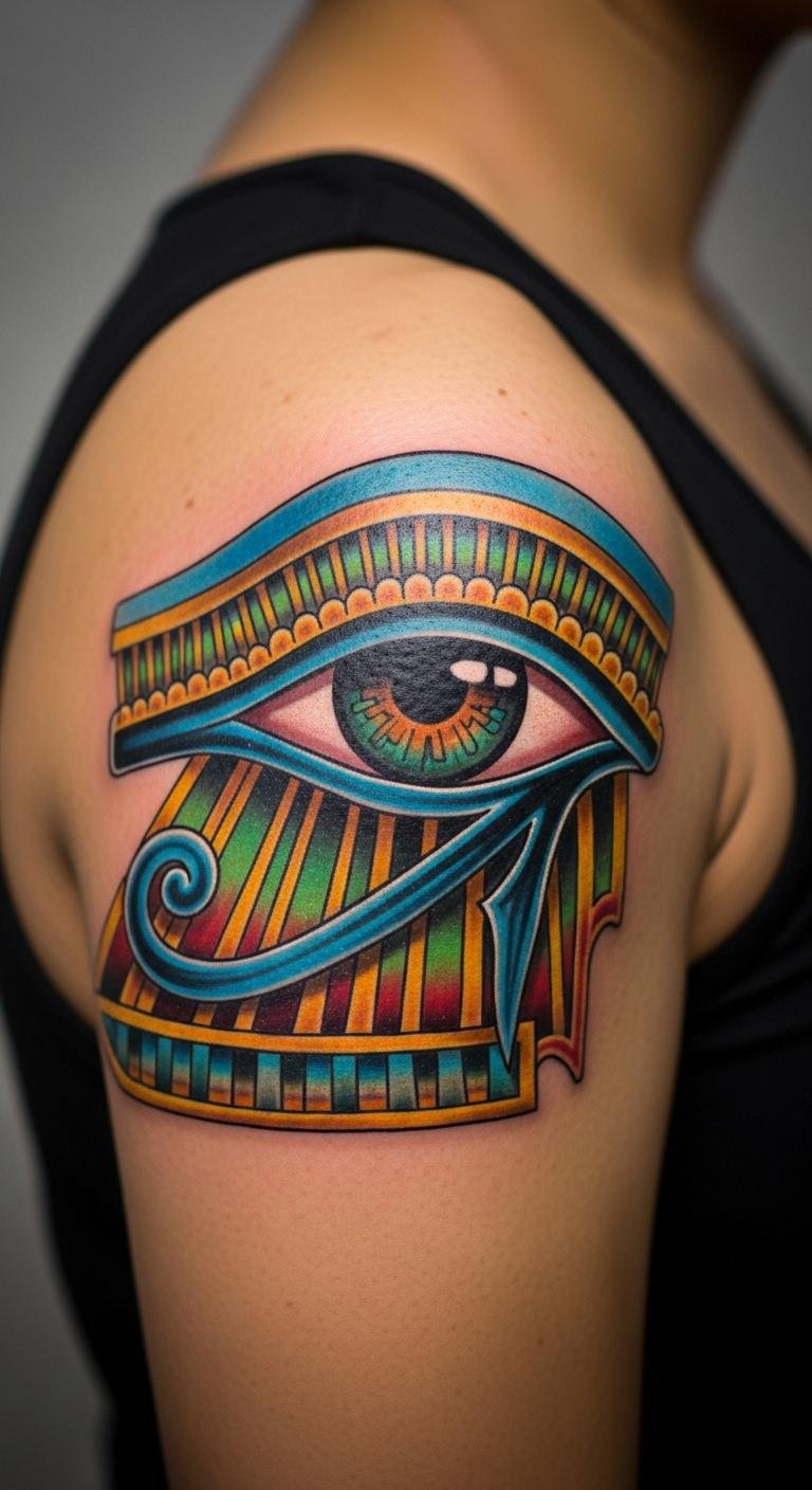Add color to the Eye of Horus on your shoulder for a vibrant boost. This placement shows off hues that represent healing. Plan with colored pencils on paper for fun. Use washable markers on your arm to preview it. Start with one shade to cut expenses. Check for artist discounts on multi-session work. Blend in a secondary color for uniqueness. It stands out in mirrors, building your self-assurance. Try this at home: Mix food coloring with lotion for a temporary version. This tattoo brings energy to your daily routine.