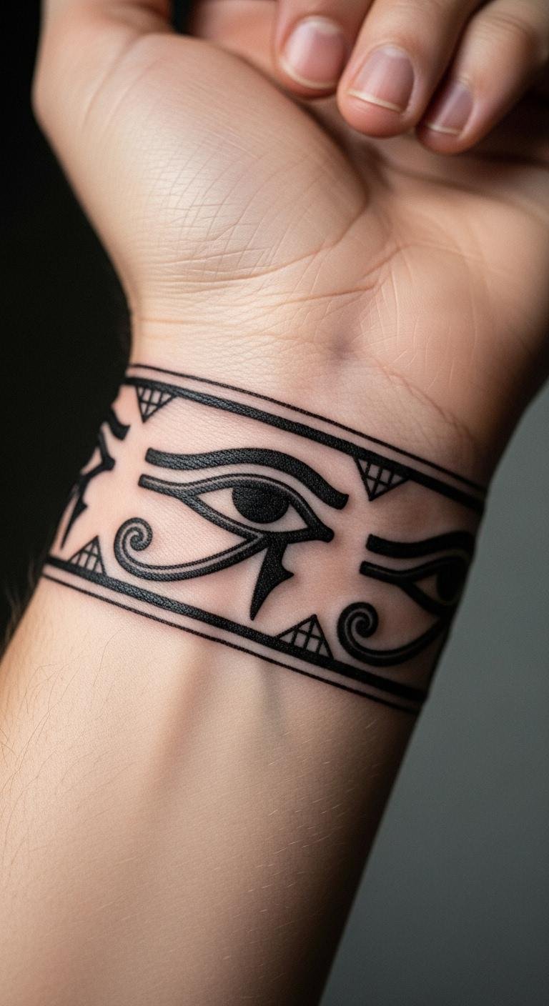 Turn the Eye of Horus into a wrist band for ongoing confidence. This style wraps around like a bracelet of strength. Map it out with string on your wrist first. Get printable stencils online for free practice. Use basic ink to keep things cheap. Look for community tattoo events with reduced rates. Add a small variation for your flair. It acts as a constant wearable reminder. Make it DIY: Wrap tape around your wrist and draw over it. This design helps you feel secure in social settings.