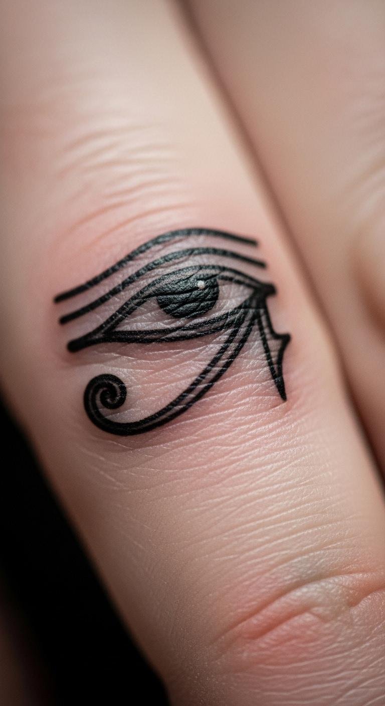 Put a small Eye of Horus on your finger for instant picks. This design fits tight spaces and sparks confidence touches. Sketch on your hand with a thin marker. Try ring stickers as a stand-in. Stick to black for low cost. Local artists might do fingers at a flat rate. Add a loop for your story. It helps during hand gestures or work. Keep it affordable: Use nail art pens to practice. This tattoo offers subtle daily encouragement.